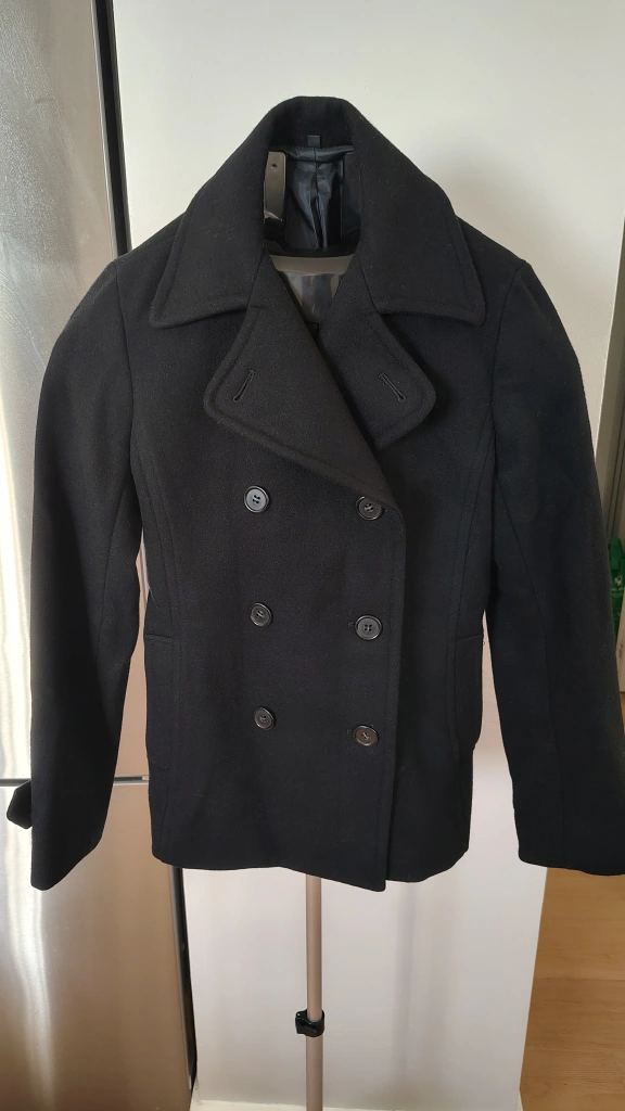 A classic black pea coat, perfect for the cooler weather! It's in like new condition and ready for a new home. It's a versatile piece that can be dressed up or down, making it a great addition to any wardrobe