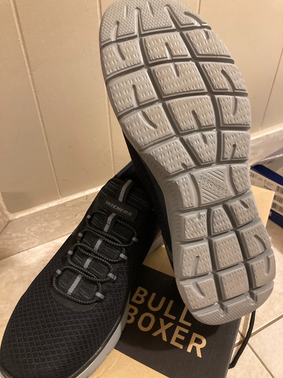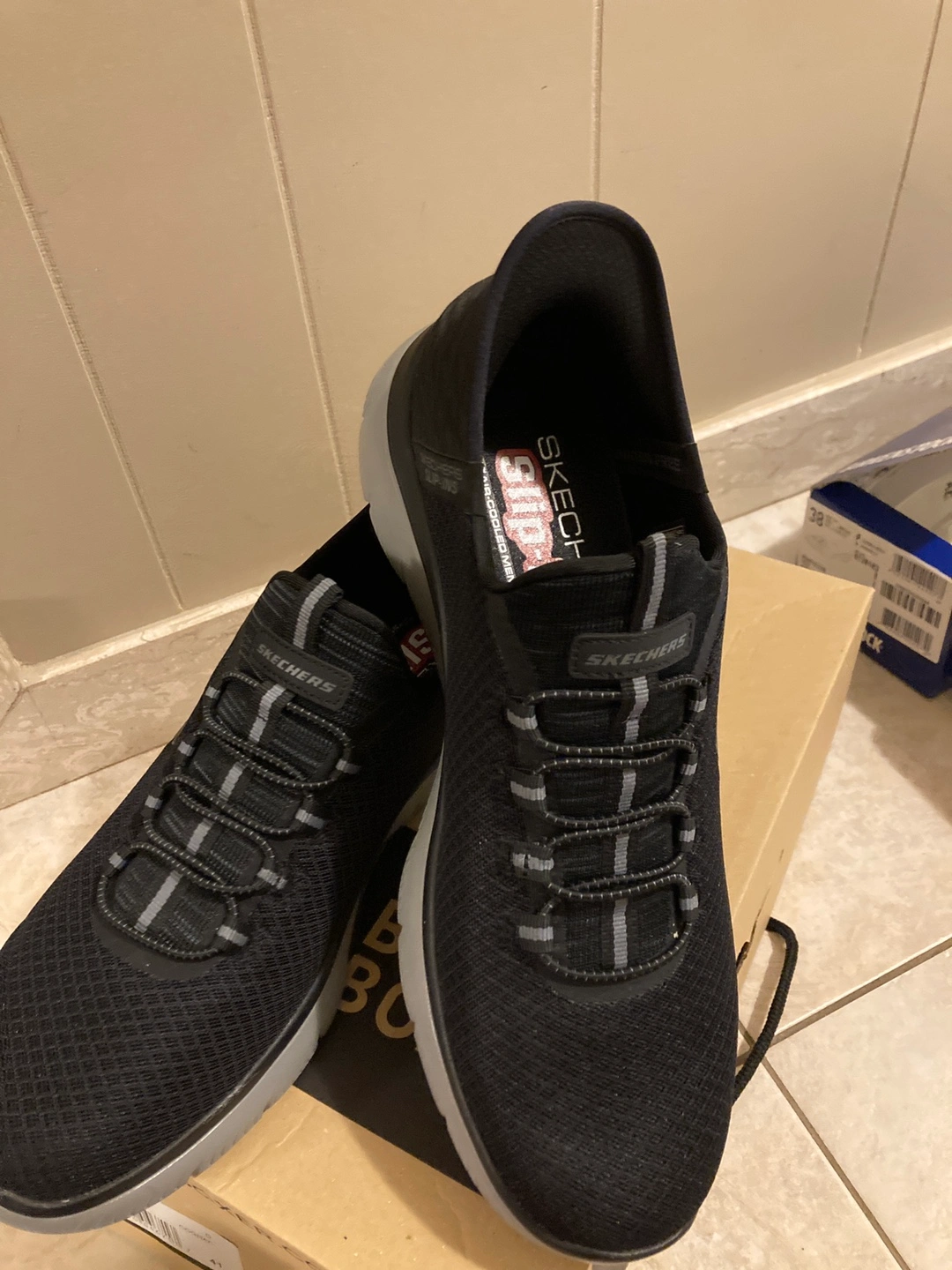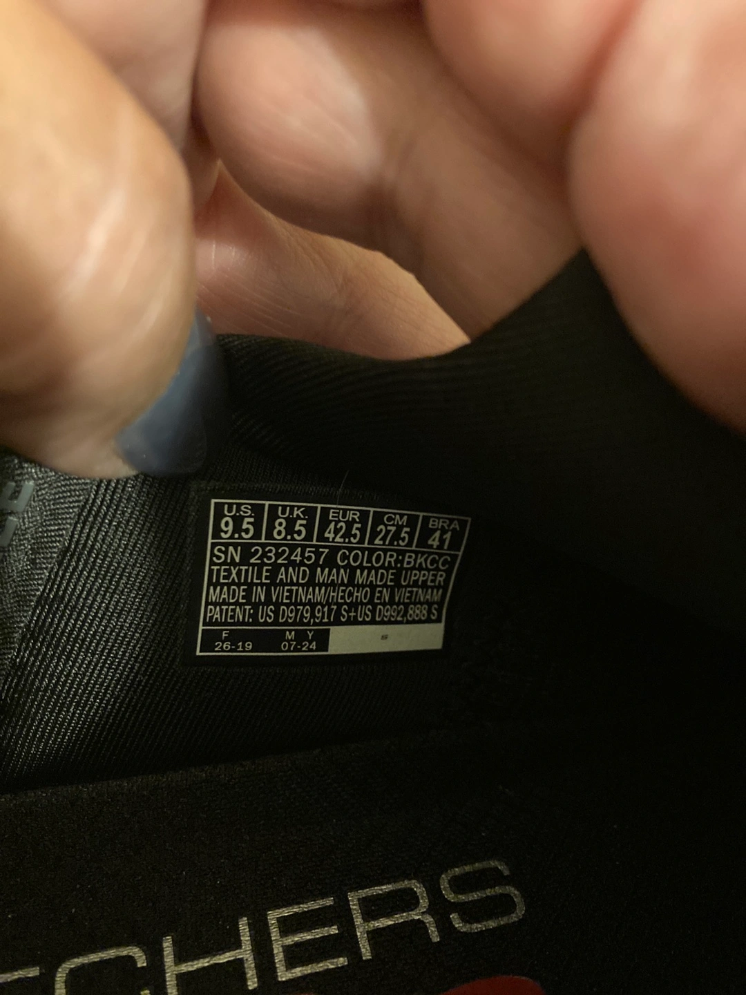 Selling a pair of Skechers Slip-ins in men's size 9.5 US. They are black and in great condition! The colour code is BRCC. They are made of textile and man-made upper material. Used once