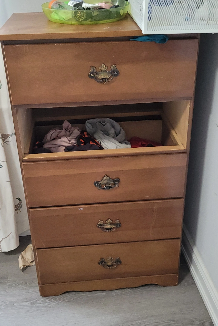 Here's a wooden dresser with four drawers. It's a great piece for adding storage to any room. The dresser has a classic design with ornate drawer pulls. It shows some signs of use, but it's still sturdy and functional. Perfect for clothes, linens, or anything else you need to keep organized!