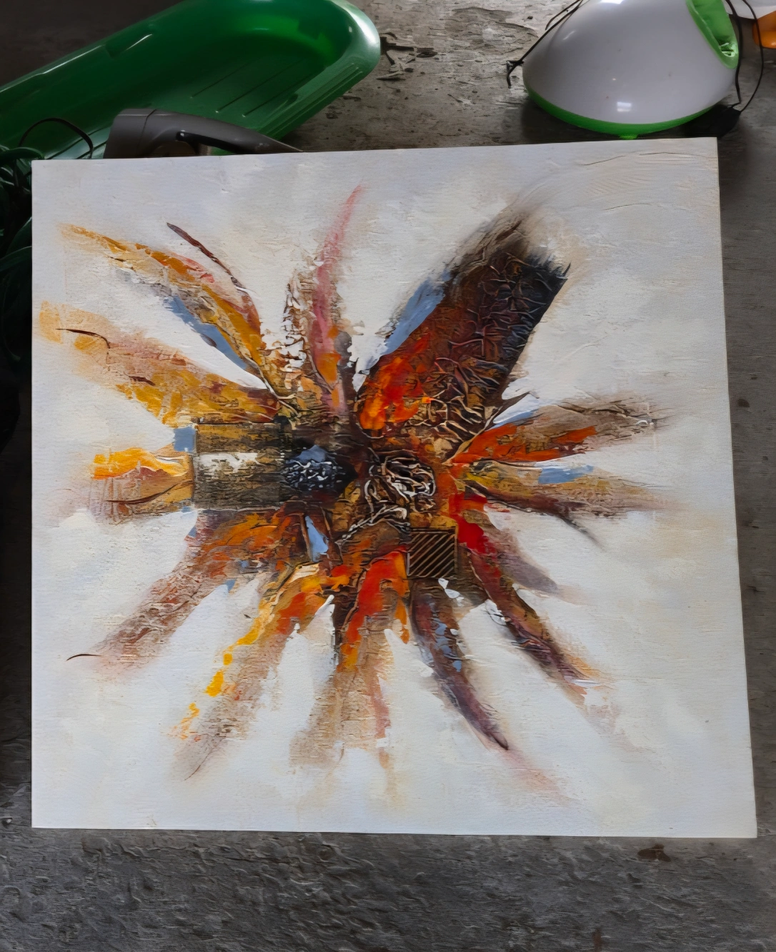 Here's a unique abstract painting, featuring a floral design with warm tones of orange, red, and brown against a white background. It's a great piece to add a pop of colour to any room