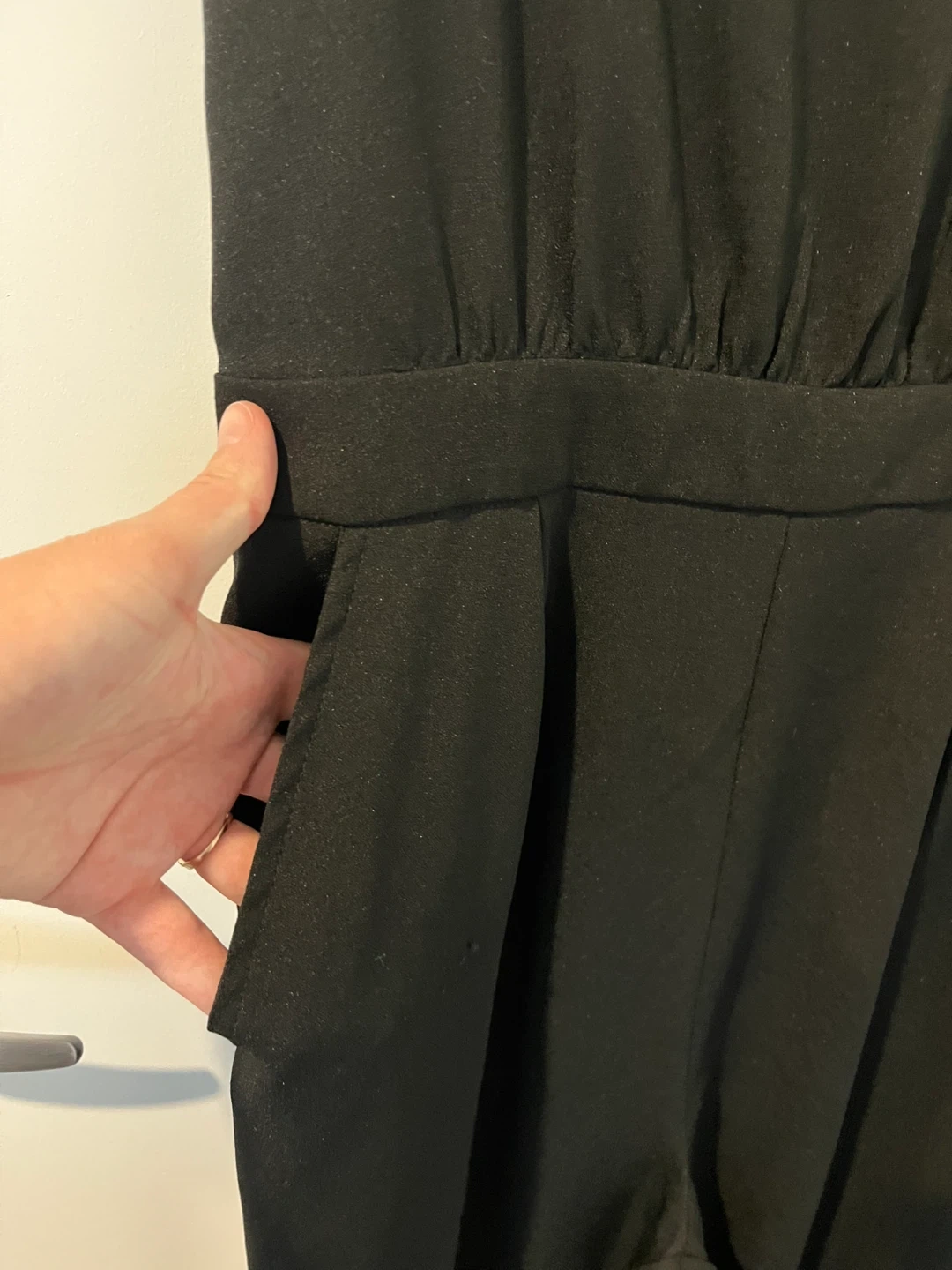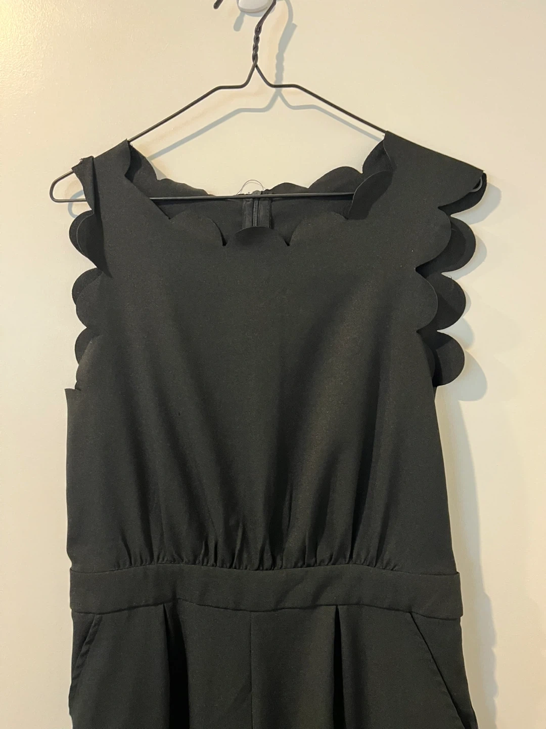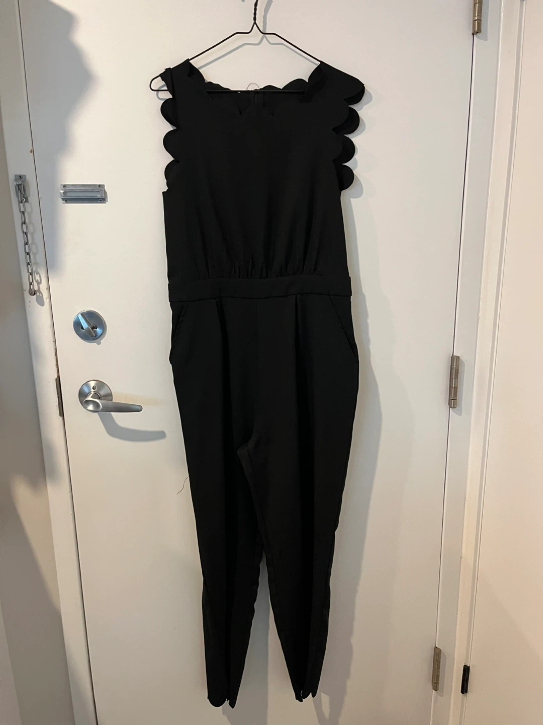 Selling a cute black jumpsuit. It's in good condition and features a unique scalloped neckline and side pockets. The material is soft and comfortable, perfect for a night out or a casual day! I’m 5’8” for reference and this fit me even up to 24 weeks pregnant so it’s not tight fitting Legs are a little short, more like a long capri Free for pickup Pickup only at corner of Dan Leckie Way and Queens Quay West