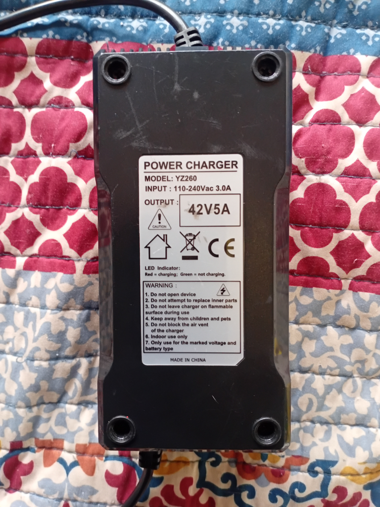 Selling a YZ260 power charger. It outputs 42V 5A and accepts input from 110-240Vac 3.0A. The LED indicator is red when charging and green when not charging. Perfect for Jetson e-bikes