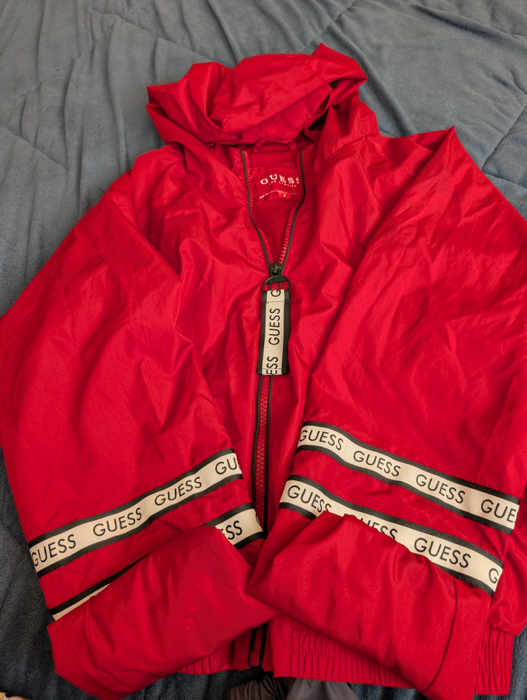 Check out this bright red Guess windbreaker jacket! It has the Guess logo printed along the sleeves and on the zipper pull. Perfect for those breezy days!