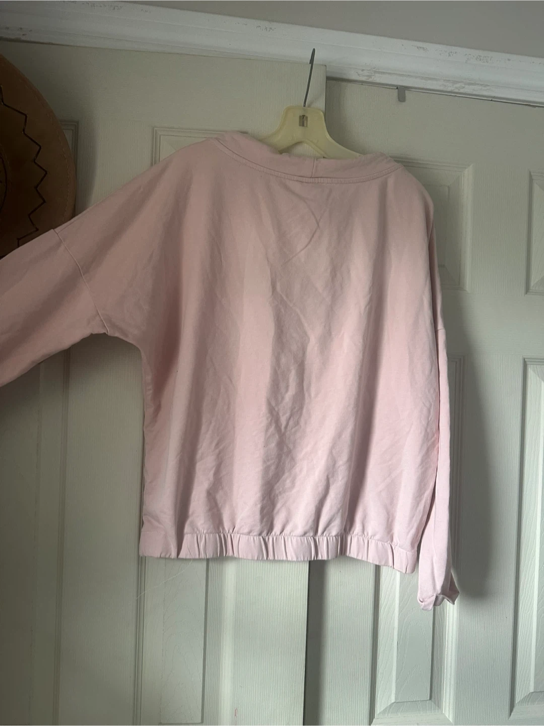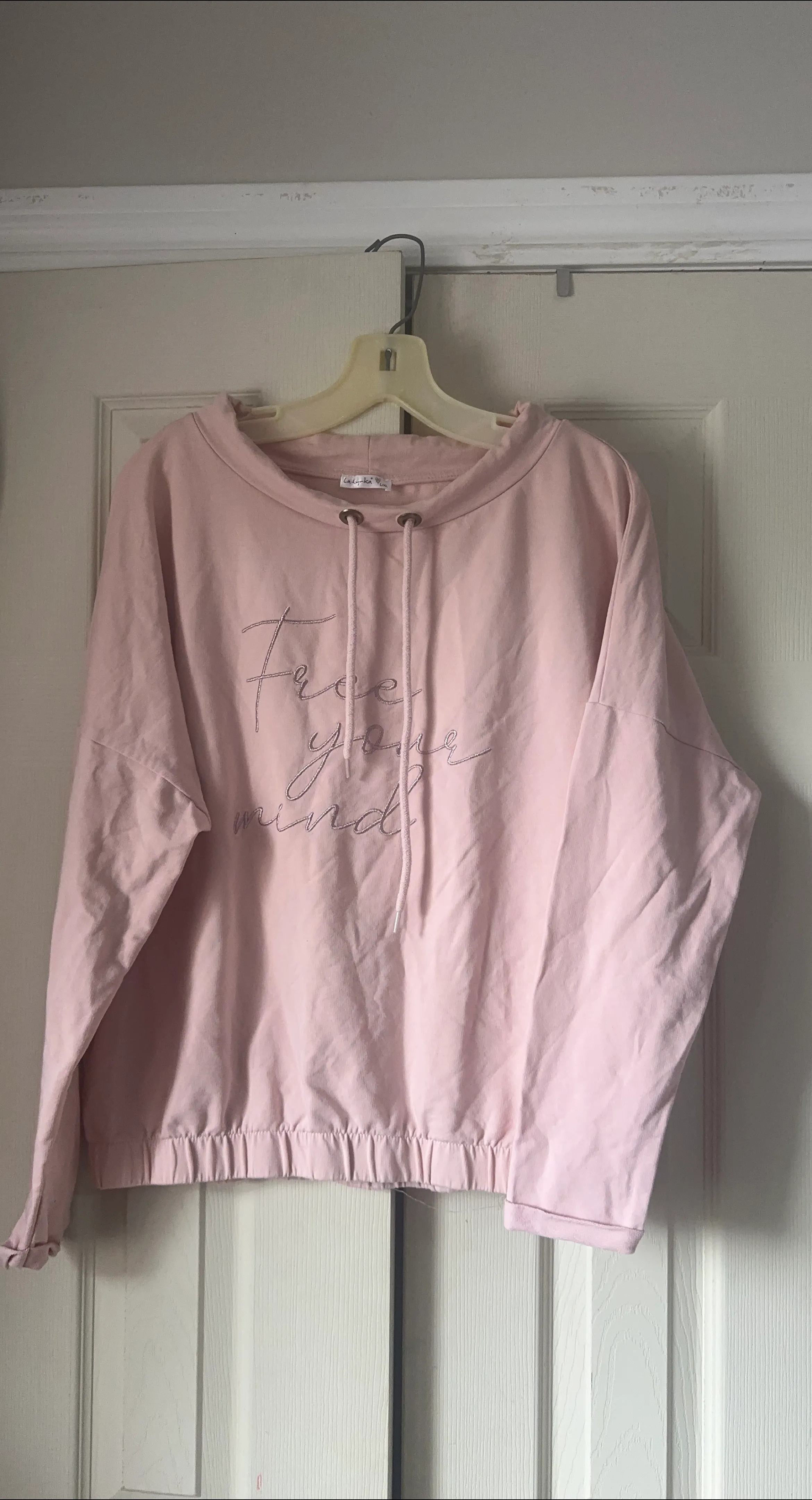 A cute and comfy pink pullover with 'Free Your Mind' embroidered on the front! It's in great condition and perfect for lounging or casual wear. The material is soft and cozy, making it ideal for those cooler days. A stylish addition to any wardrobe!