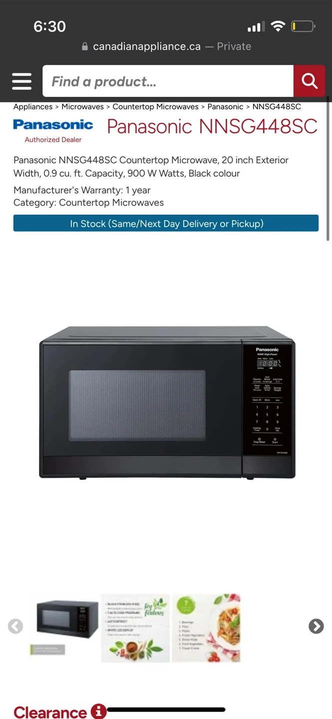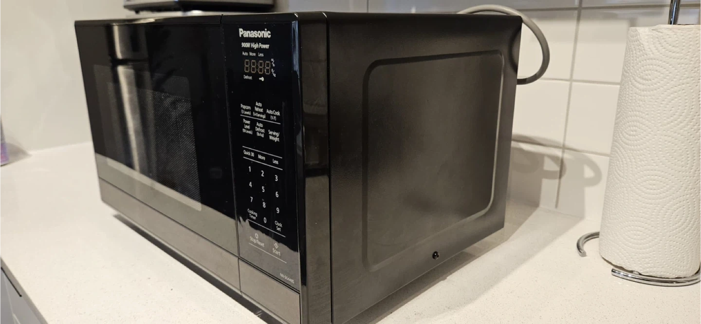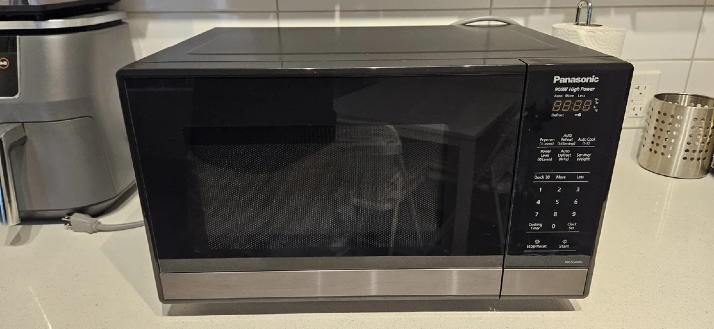 Selling a Panasonic NNSG448SC countertop microwave in black. It's a 900W high-power microwave with a 20-inch exterior width and 0.9 cu ft capacity.