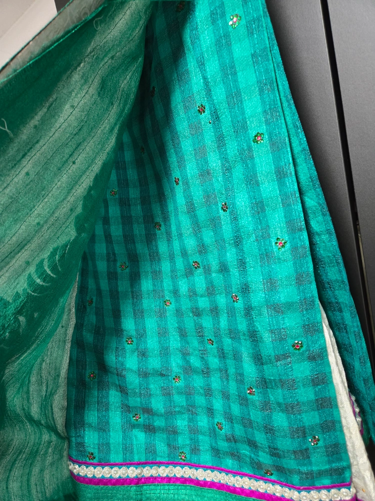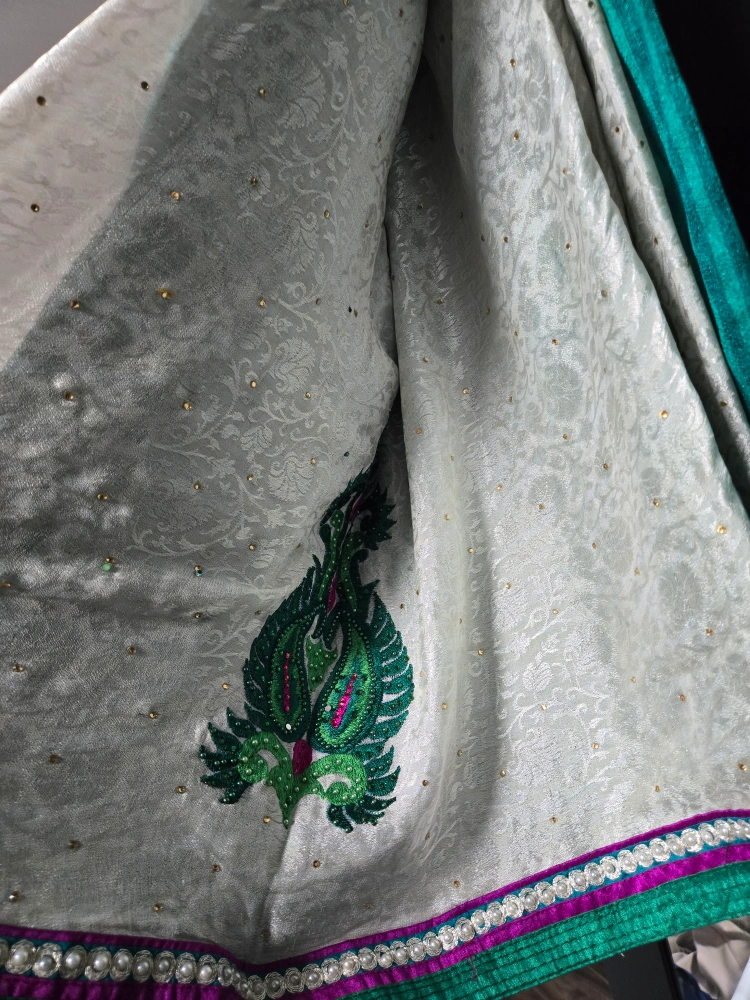 Beautiful saree with green and white detailing! It has a lovely pattern and would be perfect for a special occasion