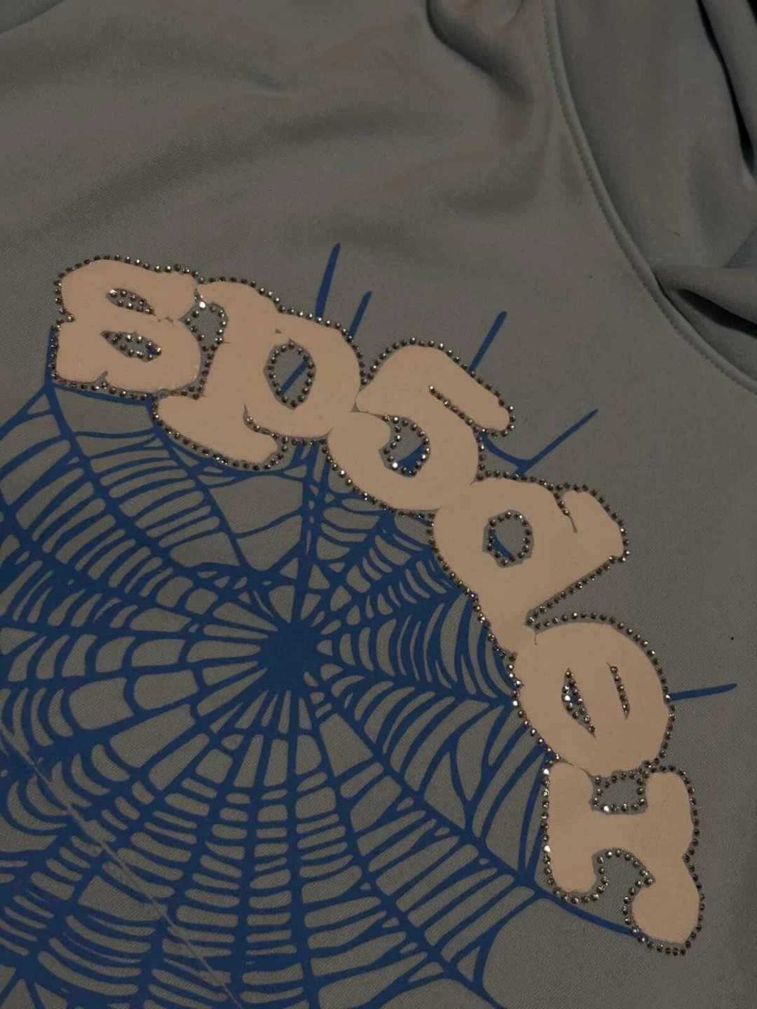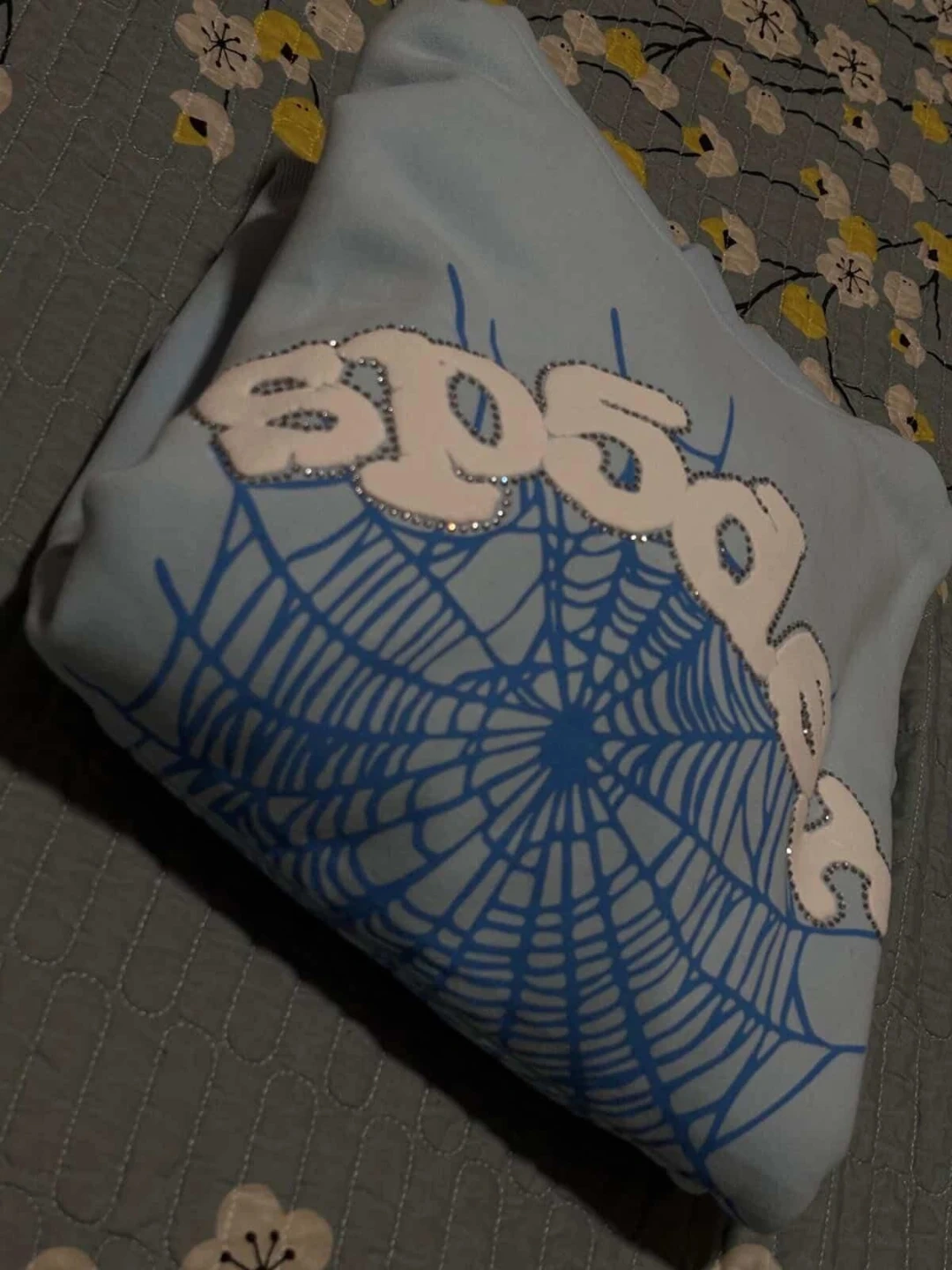 Light blue hoodie with a blue spider web graphic on the front. Features white, rhinestone-encrusted text that reads 'Sp5der'. It's a pullover style with a front pocket.