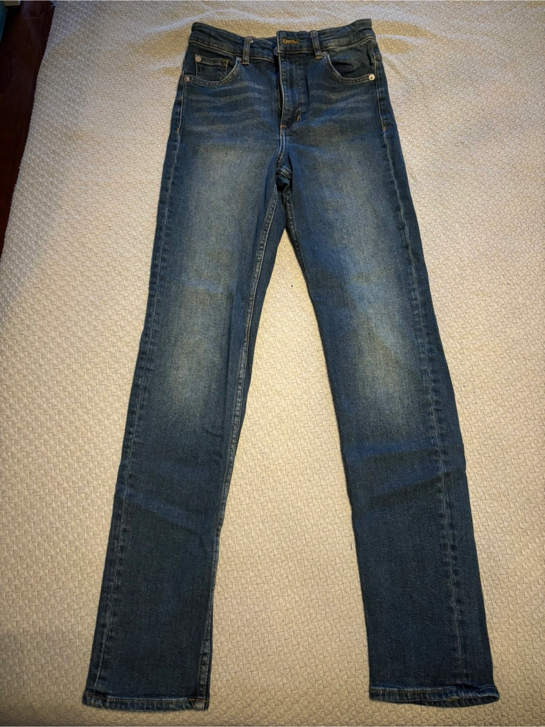 Selling a pair of denim jeans in good condition. They're a stylish addition to any wardrobe and ready for a new home!