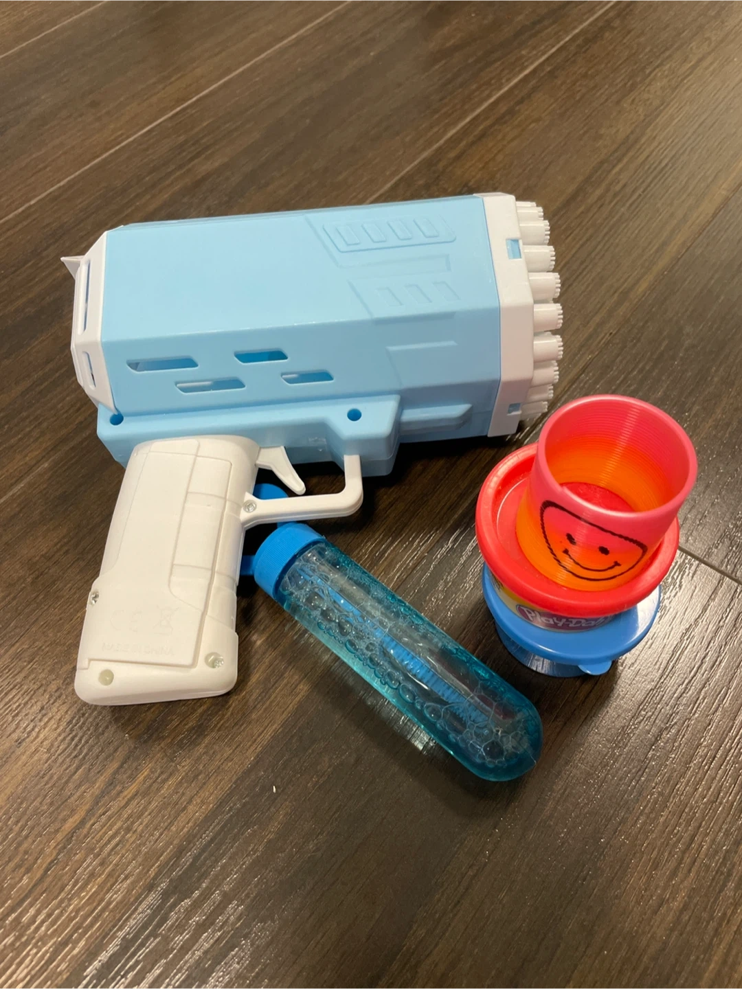 914Bubble gun, bubble wand, 2 mini play dough (unopened), and a slinky.