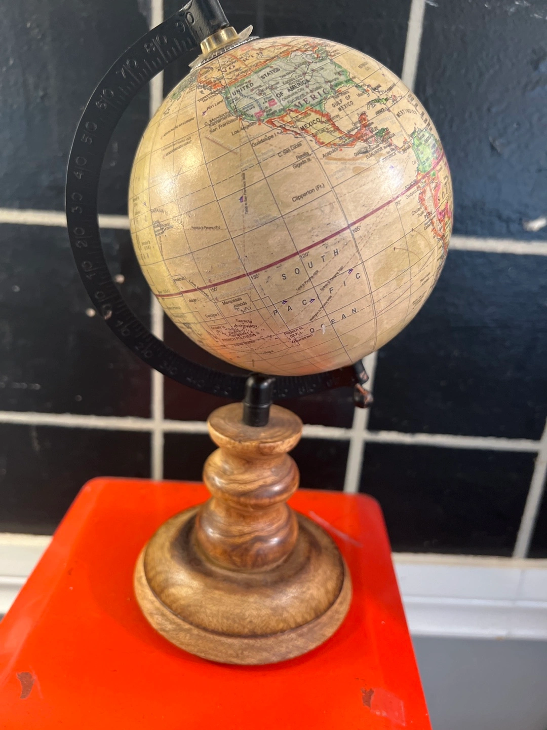 Not vintage desktop globe! Looks vintage It has a wooden base 11 1/2 “ high. You could have the whole world in your hands. Come and get it any day before noon. G.