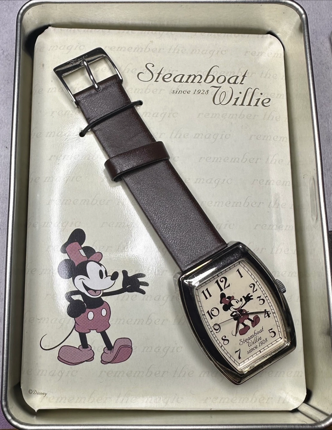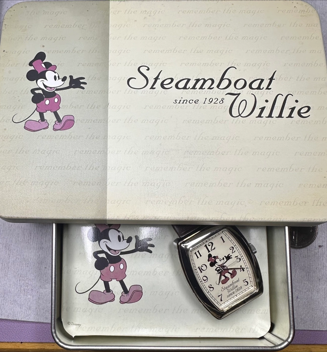 Selling a collectible vintage working Disney Steamboat Willie watch. It comes with its original box. The watch features Mickey Mouse on the face and is a charming piece for any Disney enthusiast. With new battery. Nice Gift for your love ones and friends.