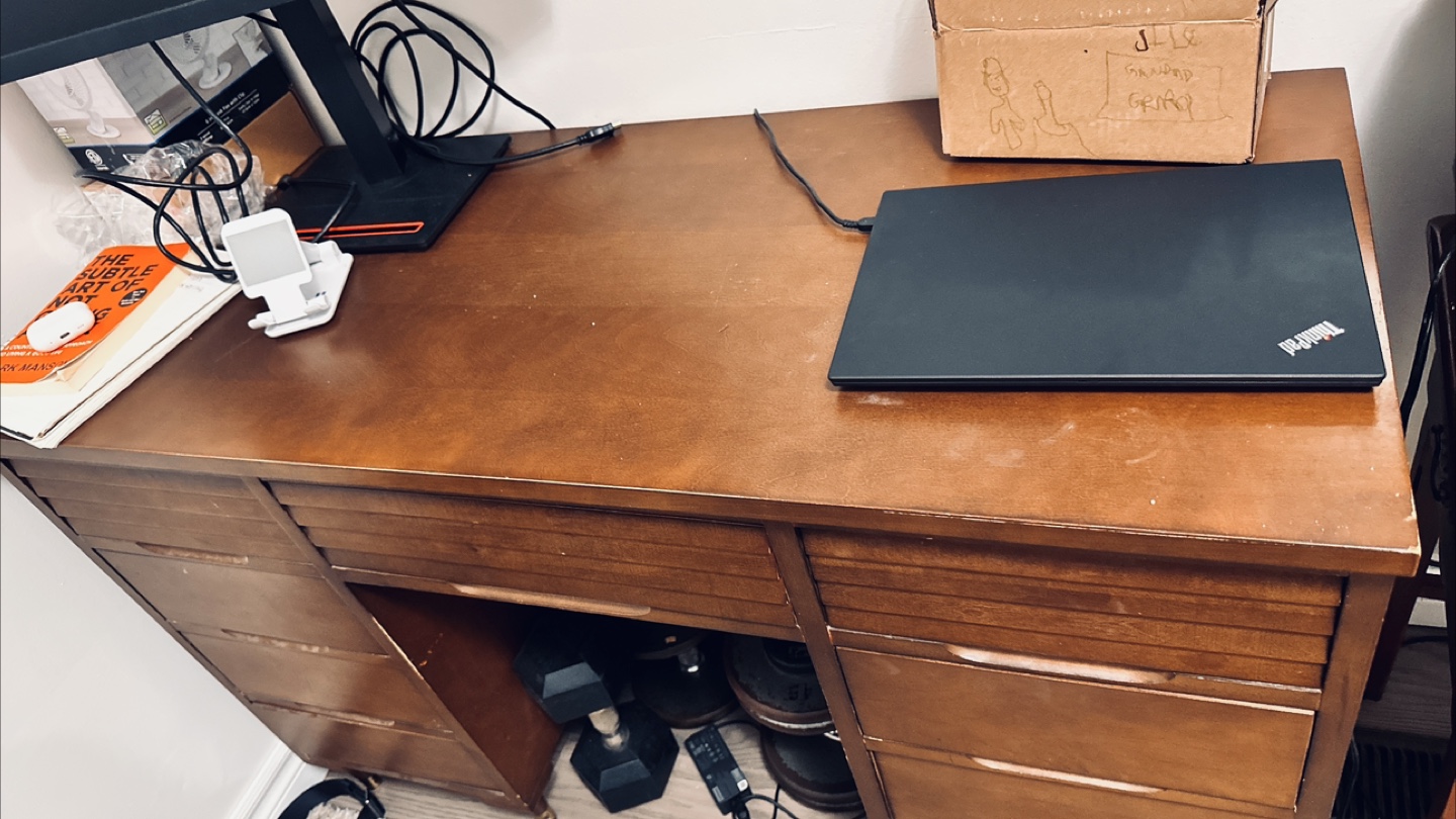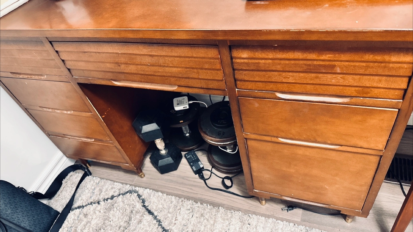 Selling a vintage wood desk. It's in good condition and has lots of storage space with multiple drawers on each side. Perfect for a home office or study area!