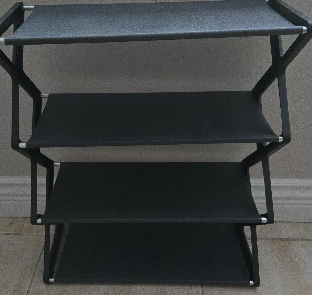Here's a handy 4-tier shoe rack to keep your entryway tidy! It's in great condition and ready to organize your footwear. The rack is black and offers ample space for shoes of all sizes. It's lightweight and easy to move around if needed