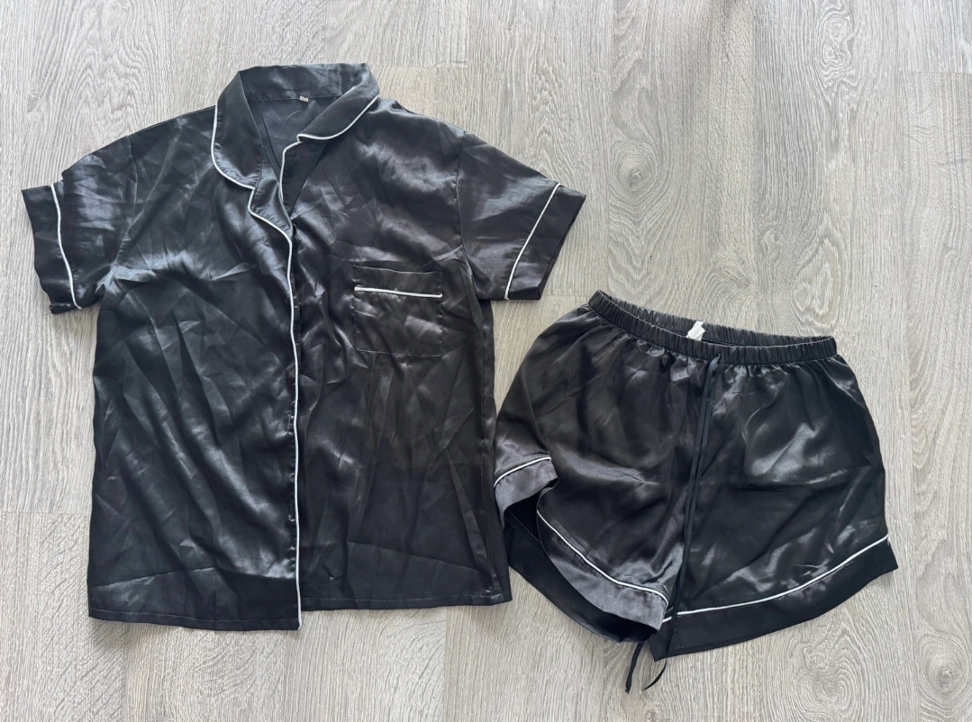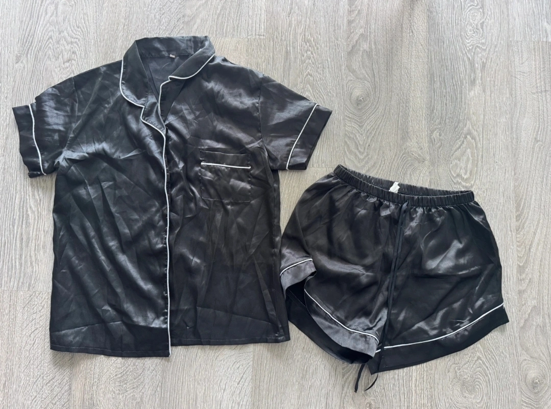 Selling a cute black satin pajama set! It includes a short-sleeved button-up top and shorts with a drawstring. Perfect for comfy nights or lounging around the house!
