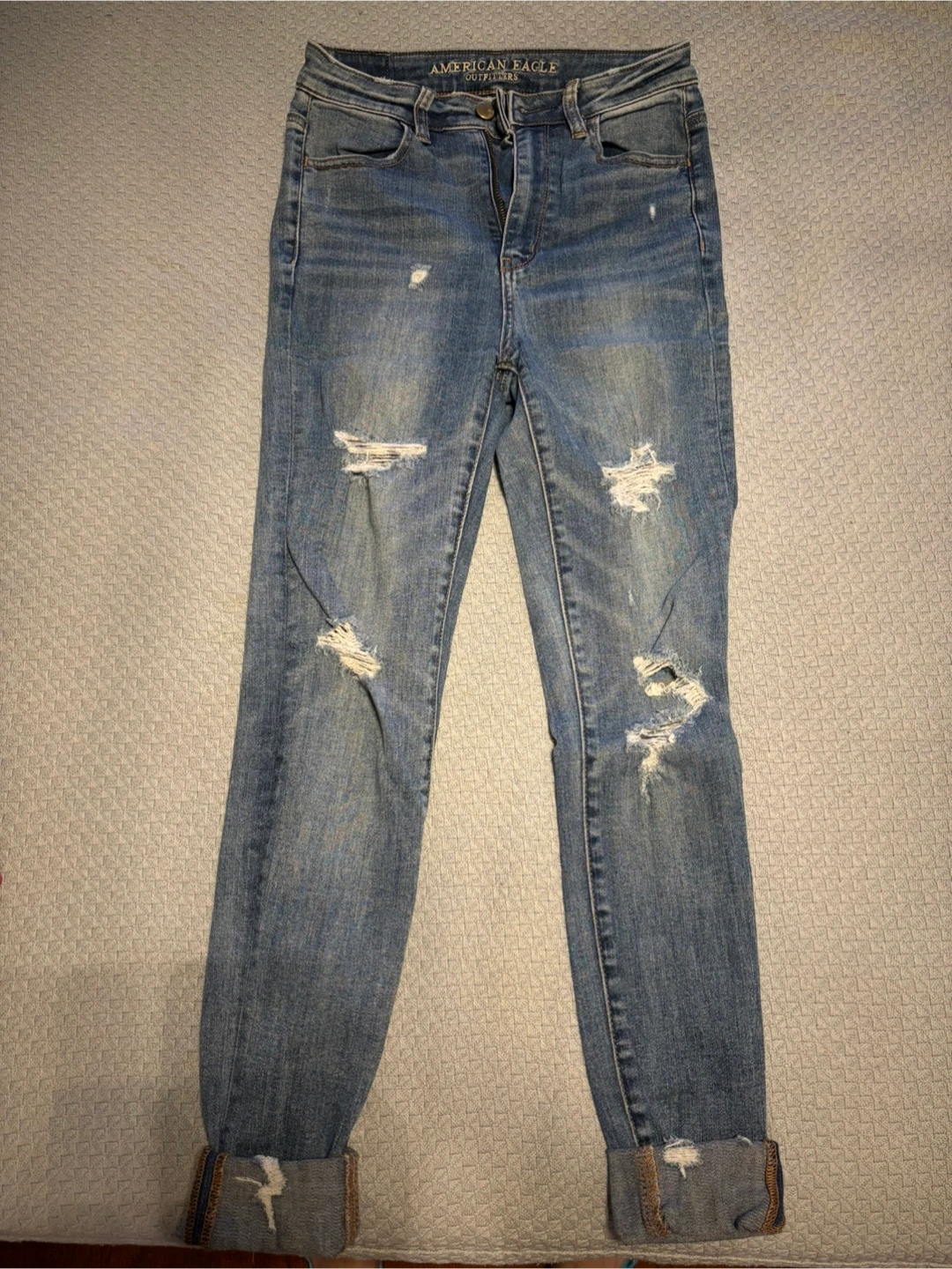 Selling a pair of American Eagle distressed jeans. They are a size 2 and have a stylish, worn look with rips and tears. Perfect for a casual outfit!