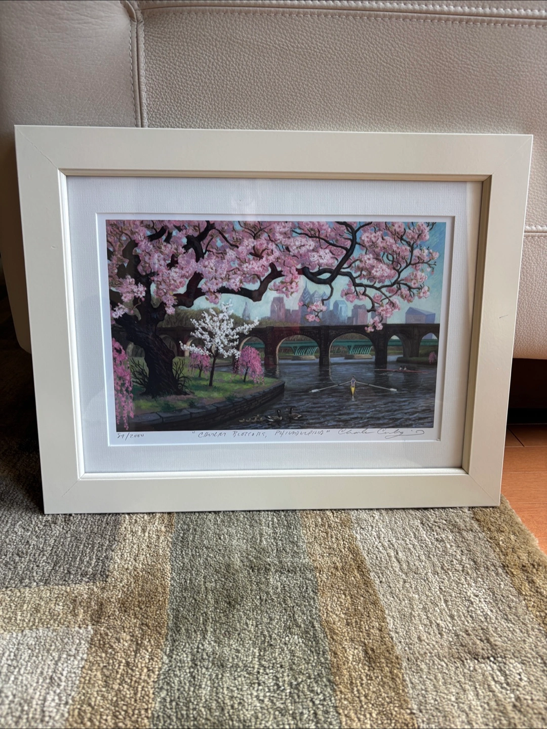 Framed art print featuring a scene of "Cherry Blossoms, Philadelphia" by Charlie Cushing. It is number 89 out of 2000 prints. The frame is white lacquered wood and has one very minor scratch as shown in one of the pictures. Otherwise in excellent condition. It measures 14 1/4 in height and 18 1/4 in width. From a PF and SF home. Pickup only in the St Lawrence market area of downtown Toronto. Cash only.