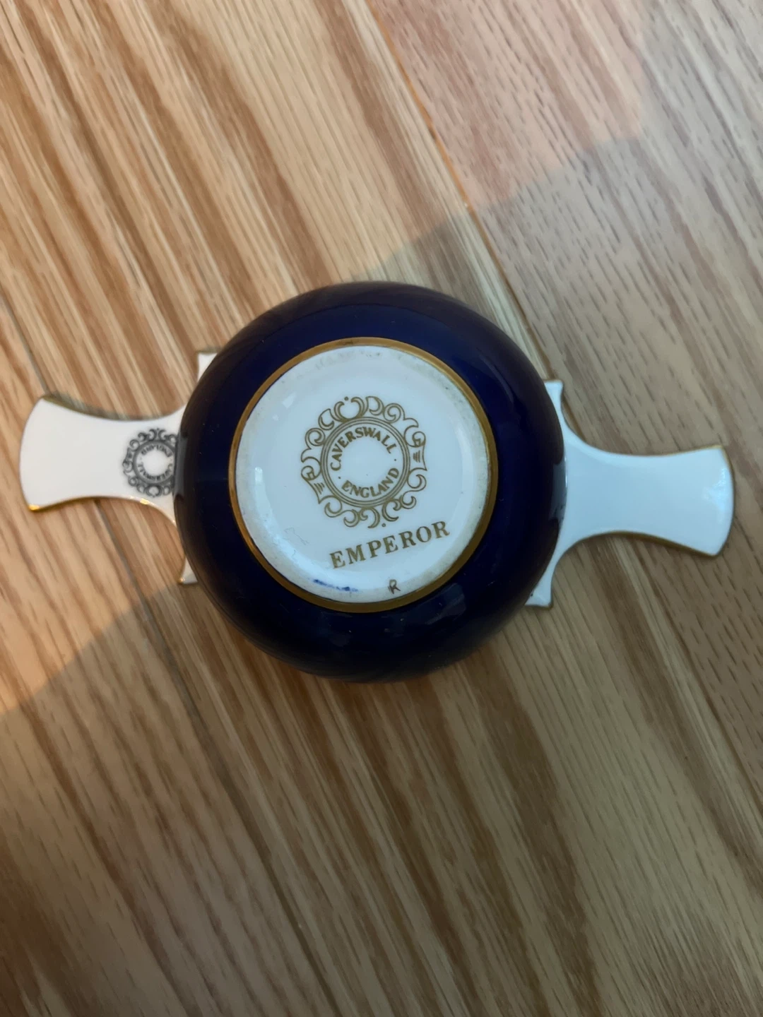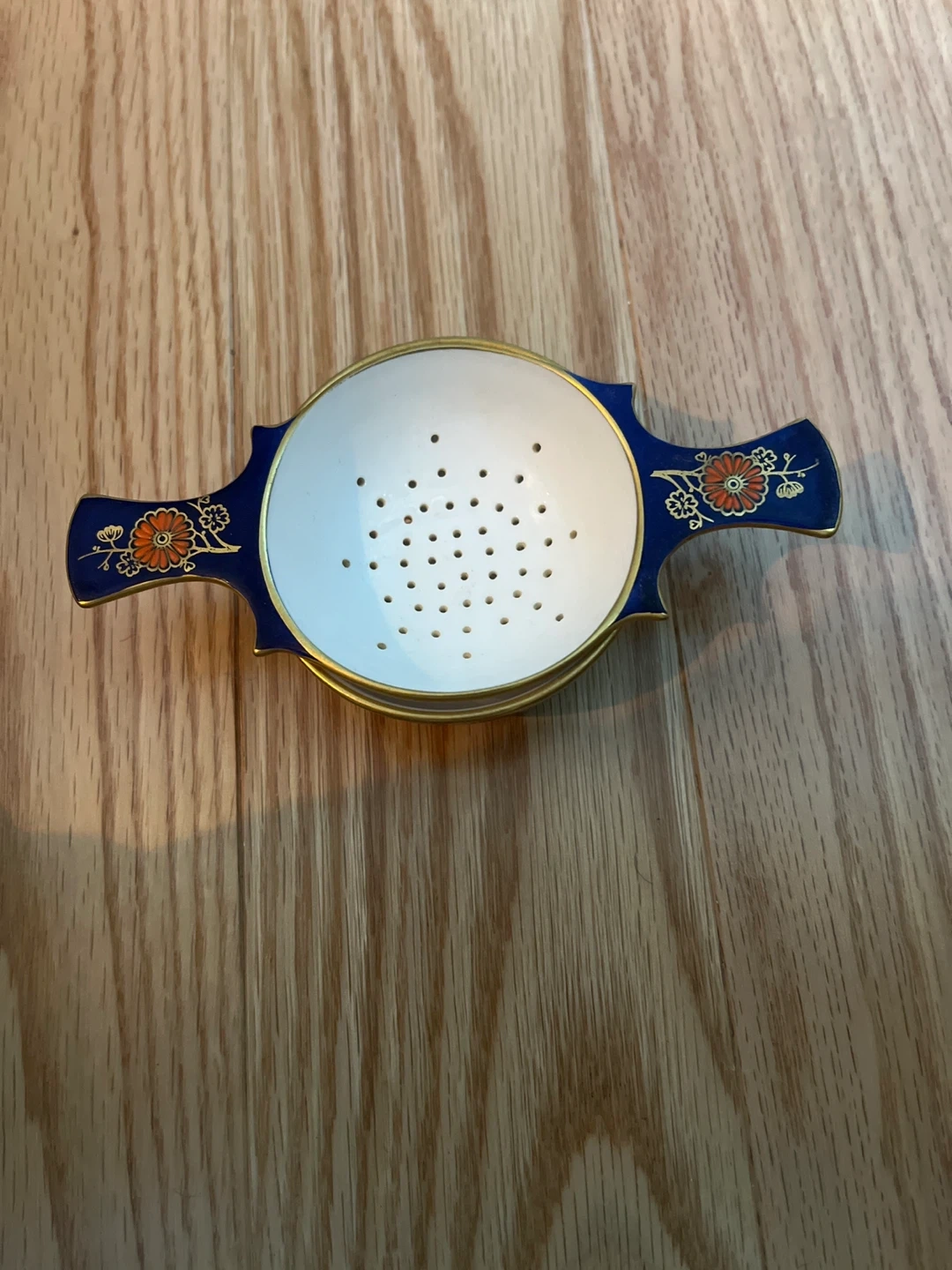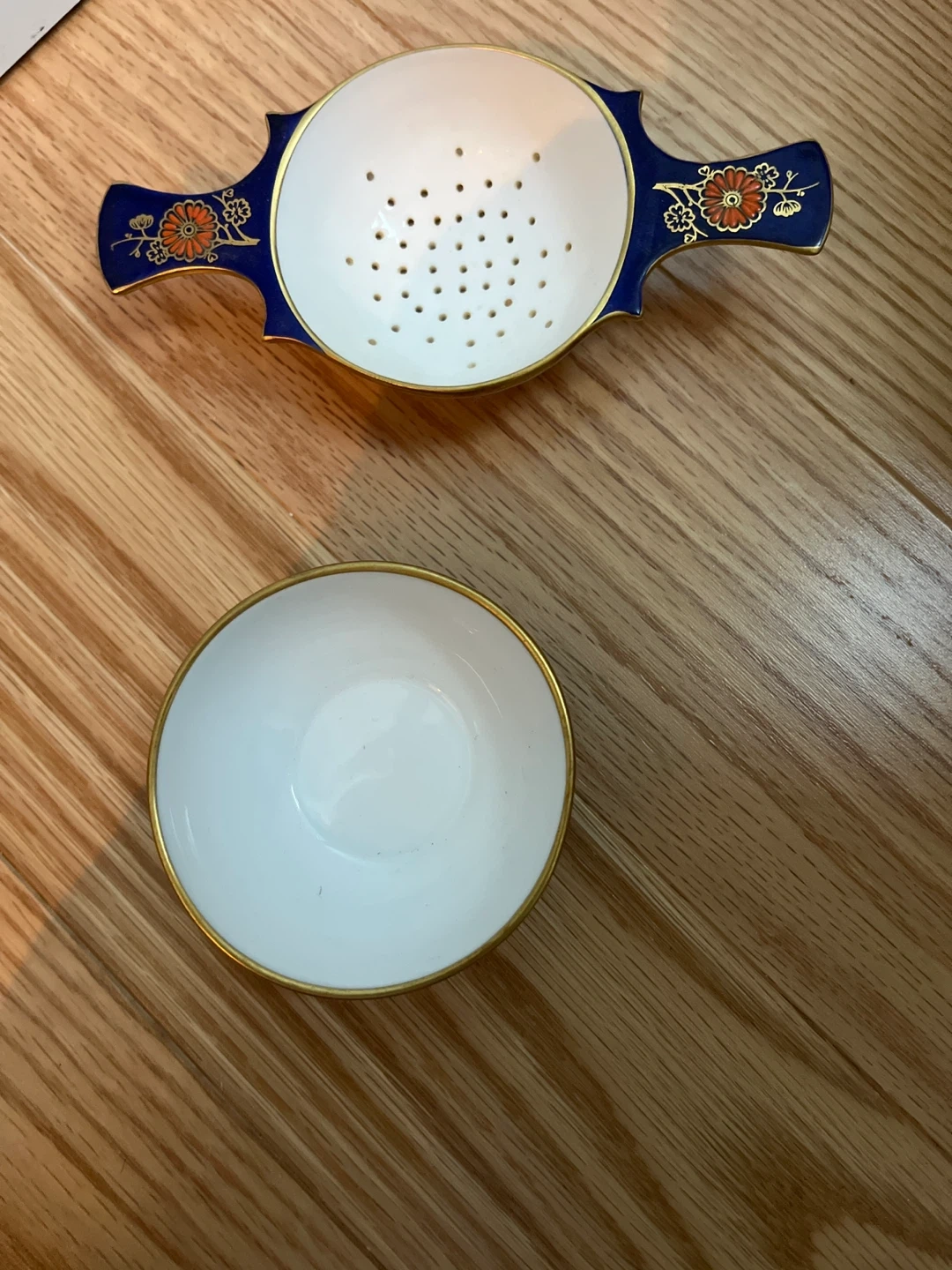 Here's a lovely Caverswall England Emperor tea strainer and matching cup. It's in great shape and ready for a new home. The set features a beautiful blue and gold design with floral accents. Perfect for tea enthusiasts!