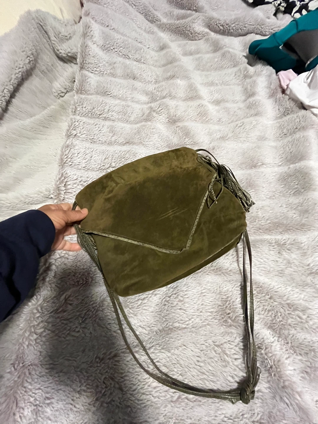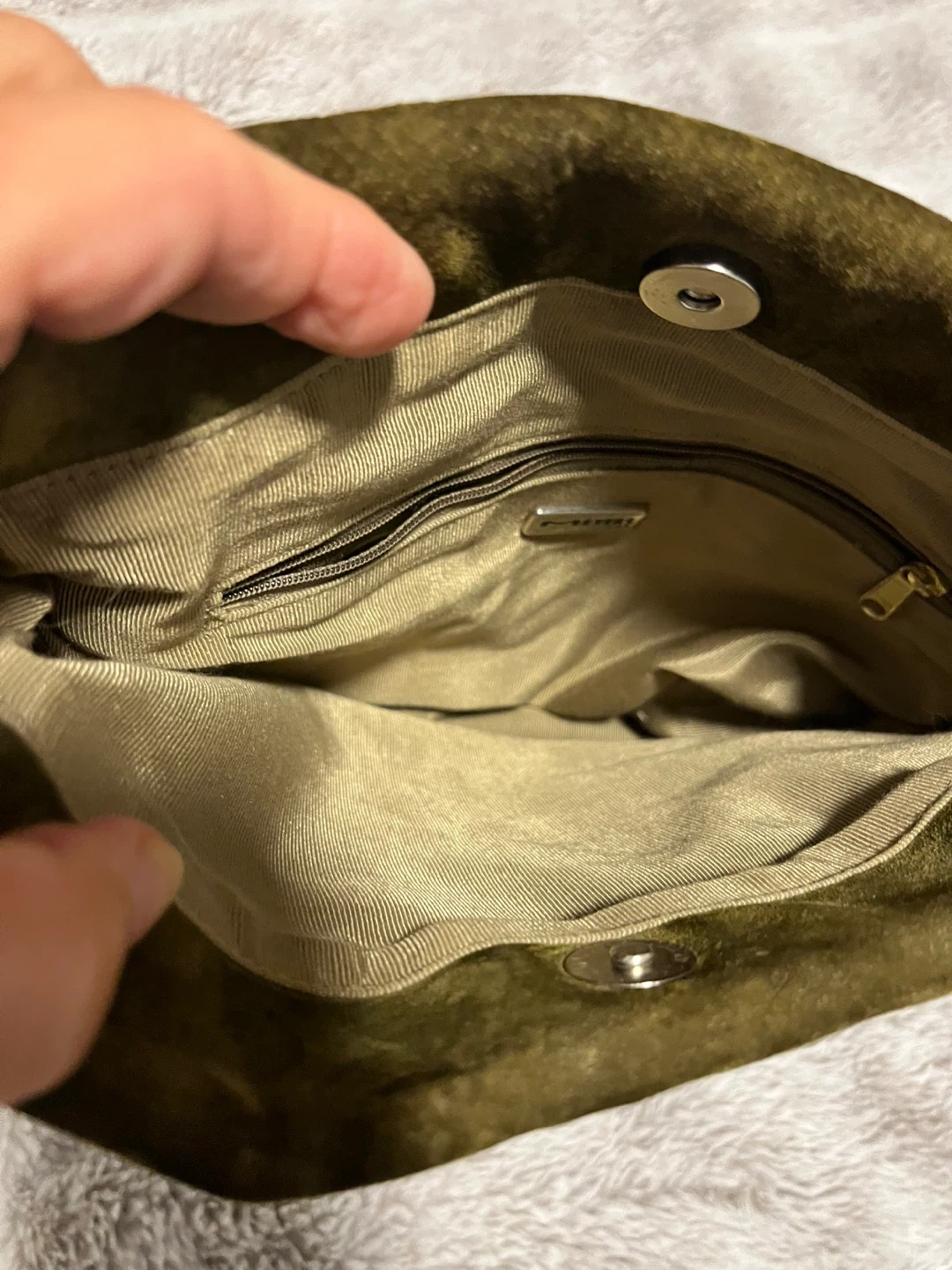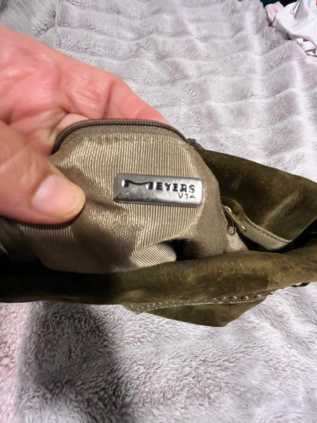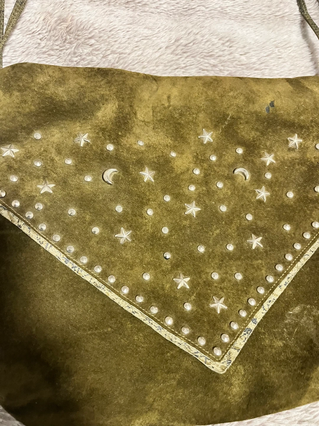 This is a cute Meyers USA shoulder bag in an olive green colour! It's made of suede and has a unique star and moon design with silver studs. The interior is lined with a zippered pocket for your valuables. Perfect for adding a touch of boho chic to any outfit