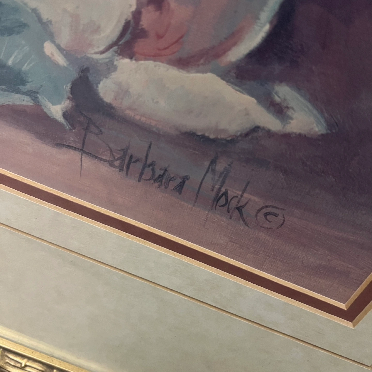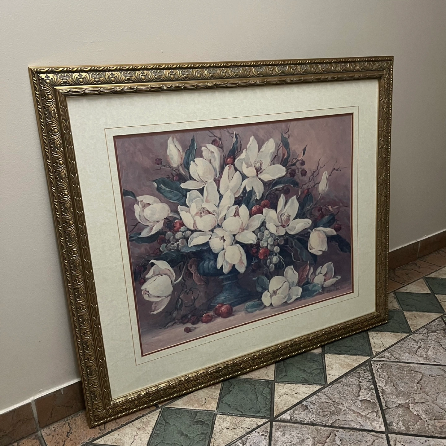 Selling a framed floral painting. It's signed by Barbara Mock. The frame is gold coloured. It's in good condition and would look great in any room