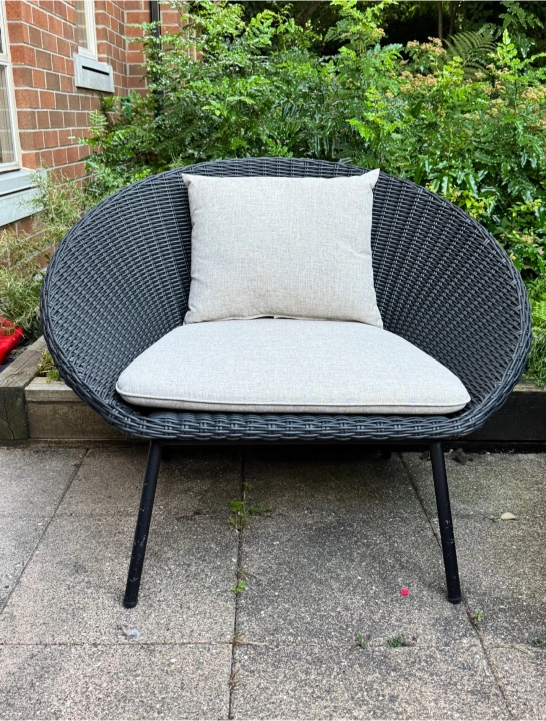 Used twice . Selling a stylish wicker outdoor egg chair! It comes with a comfy cushion, perfect for relaxing on your patio or in your garden. The chair is in great condition and ready for a new home.