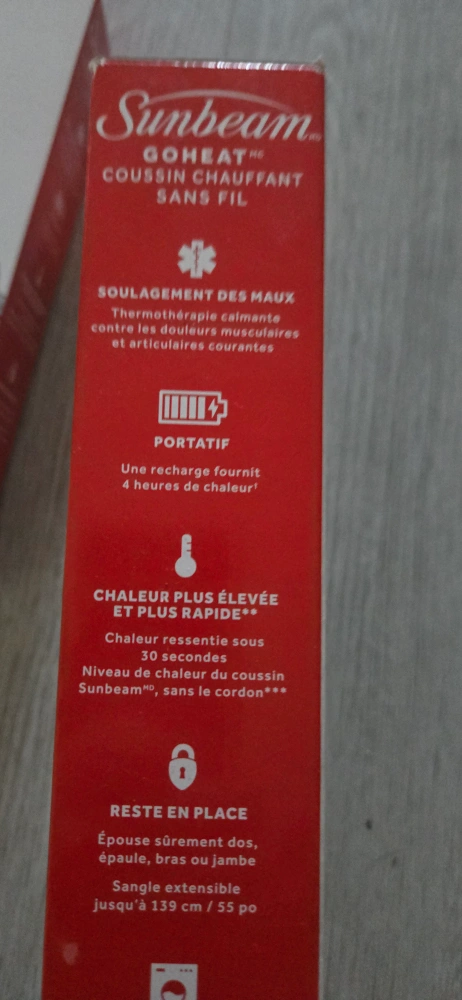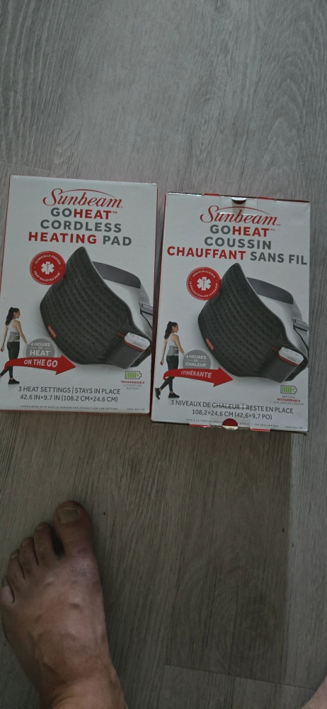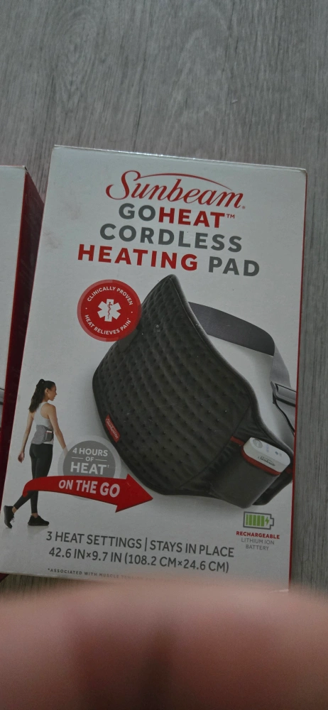 I have 2 Sunbeam GoHeat Cordless Heating Pad available, still brand new in its box! It's perfect for on-the-go use with 4 hours of heat. It has 3 heat settings and stays in place, measuring 42.6 in x 9.7 in (108.2 cm x 24.6 cm). It's rechargeable and great for muscle tension
