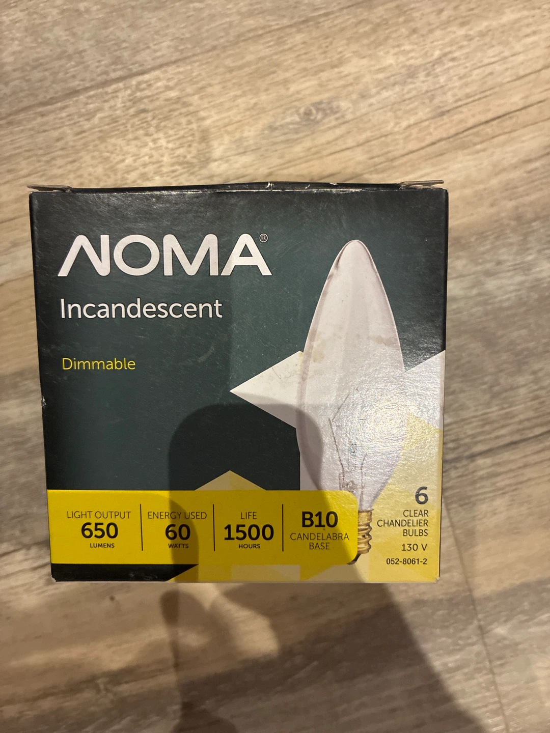 Giving away 3 NOMA incandescent dimmable chandelier bulbs. (Three left in pack.) These are clear B10 candelabra base bulbs. They have a light output of 650 lumens and use 60 watts of energy, with a life of 1500 hours. Never used.