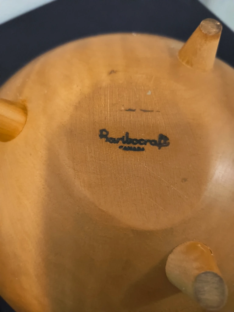 Selling a lovely Baribocraft Wooden footed salad bowl set, perfect for serving salads or snacks! Includes a large serving bowl with unique detailing, four smaller bowls, and a wooden serving fork and spoon. The set is in good condition and ready to add a touch of rustic charm to your table. Made in Canada
