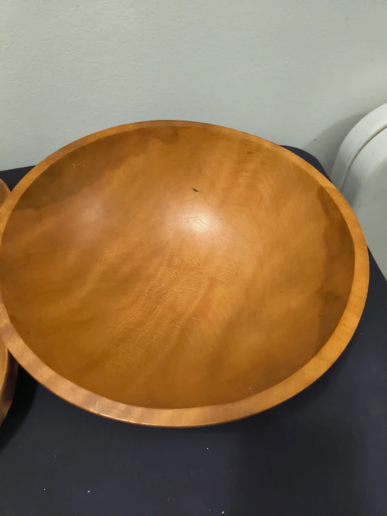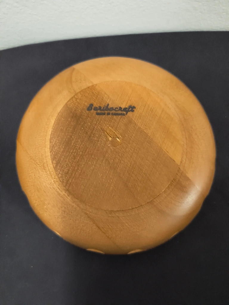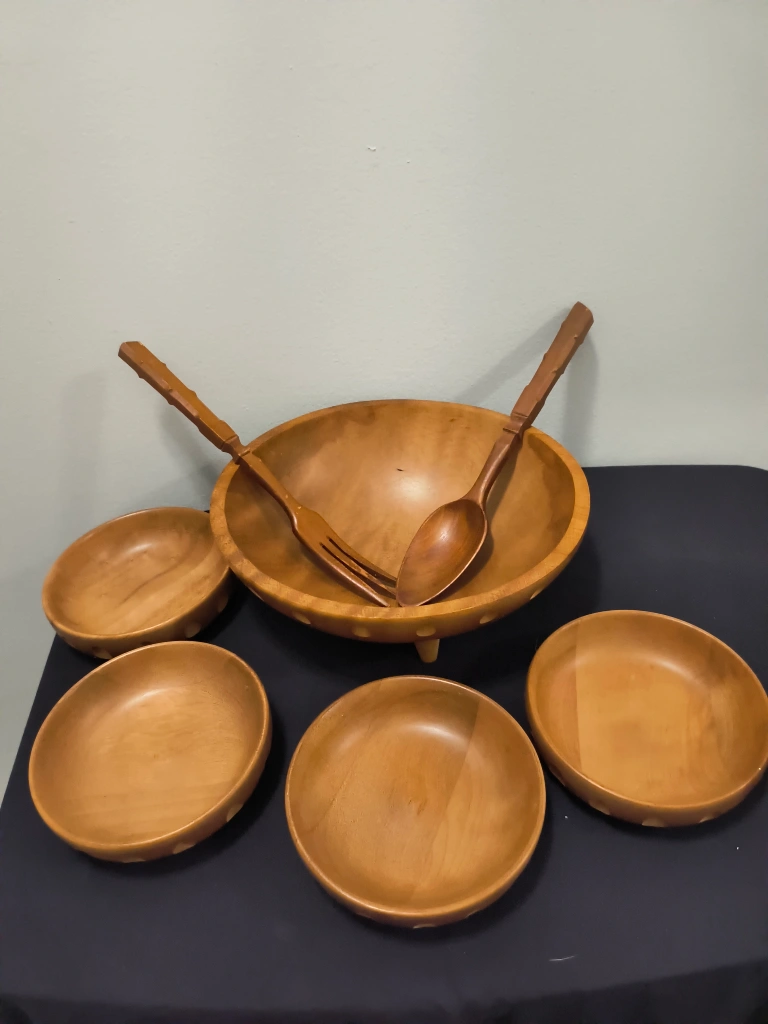 Selling a lovely Baribocraft Wooden footed salad bowl set, perfect for serving salads or snacks! Includes a large serving bowl with unique detailing, four smaller bowls, and a wooden serving fork and spoon. The set is in good condition and ready to add a touch of rustic charm to your table. Made in Canada