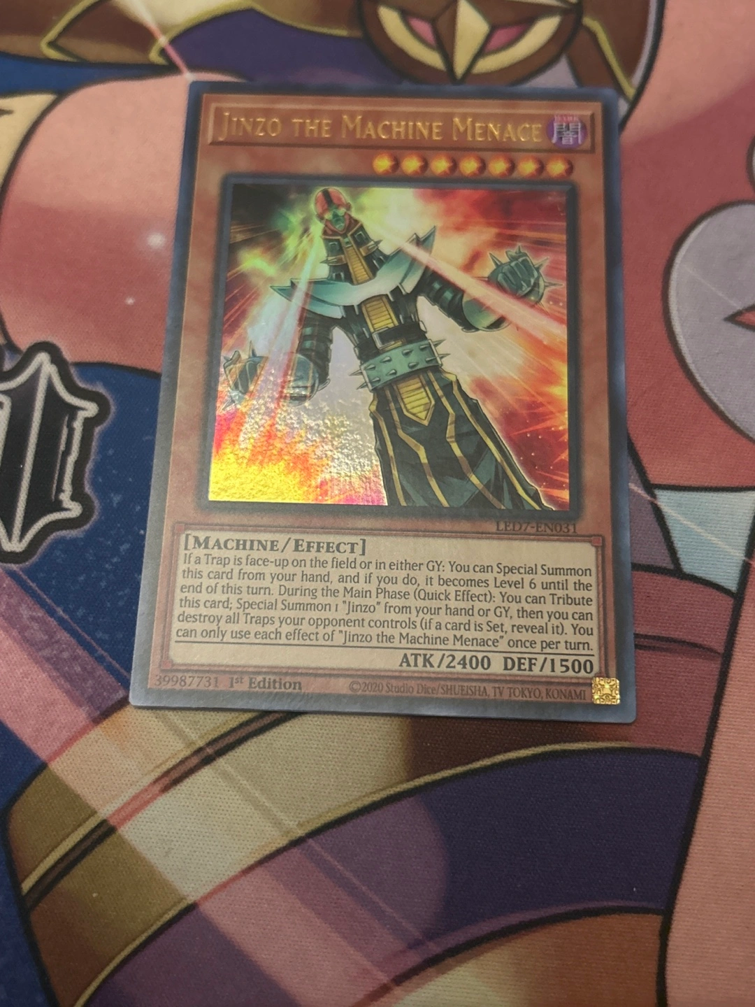 Selling a Jinzo The Machine Menace Yu-Gi-Oh! card. It's a Machine/Effect card with ATK/2400 and DEF/1500. It's a 1st Edition card from 2020 Studio Dice/SHUEISHA, TV TOKYO, KONAMI.