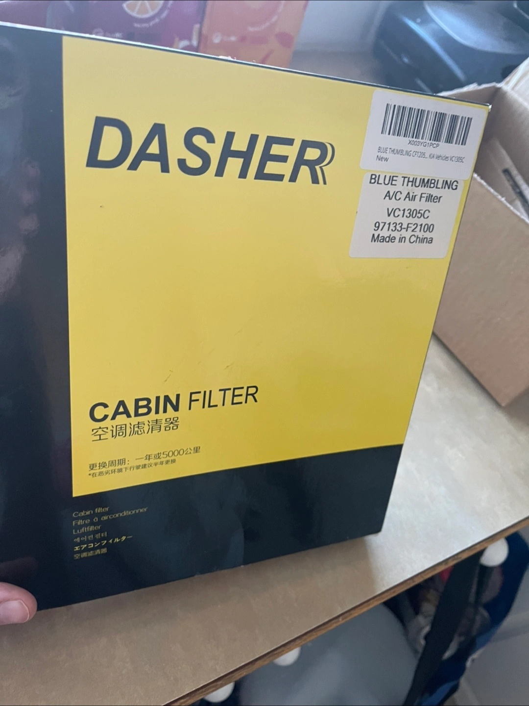 Selling a brand new Dasher Blue Thumbling A/C Air Filter, model VC1305C. It's still in its original box and ready to keep your car's air clean and fresh!