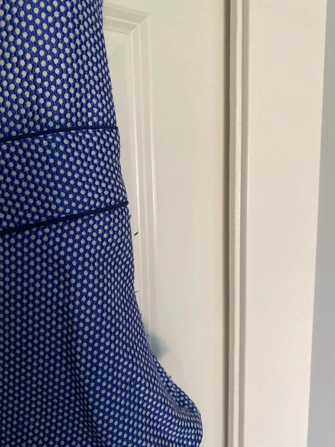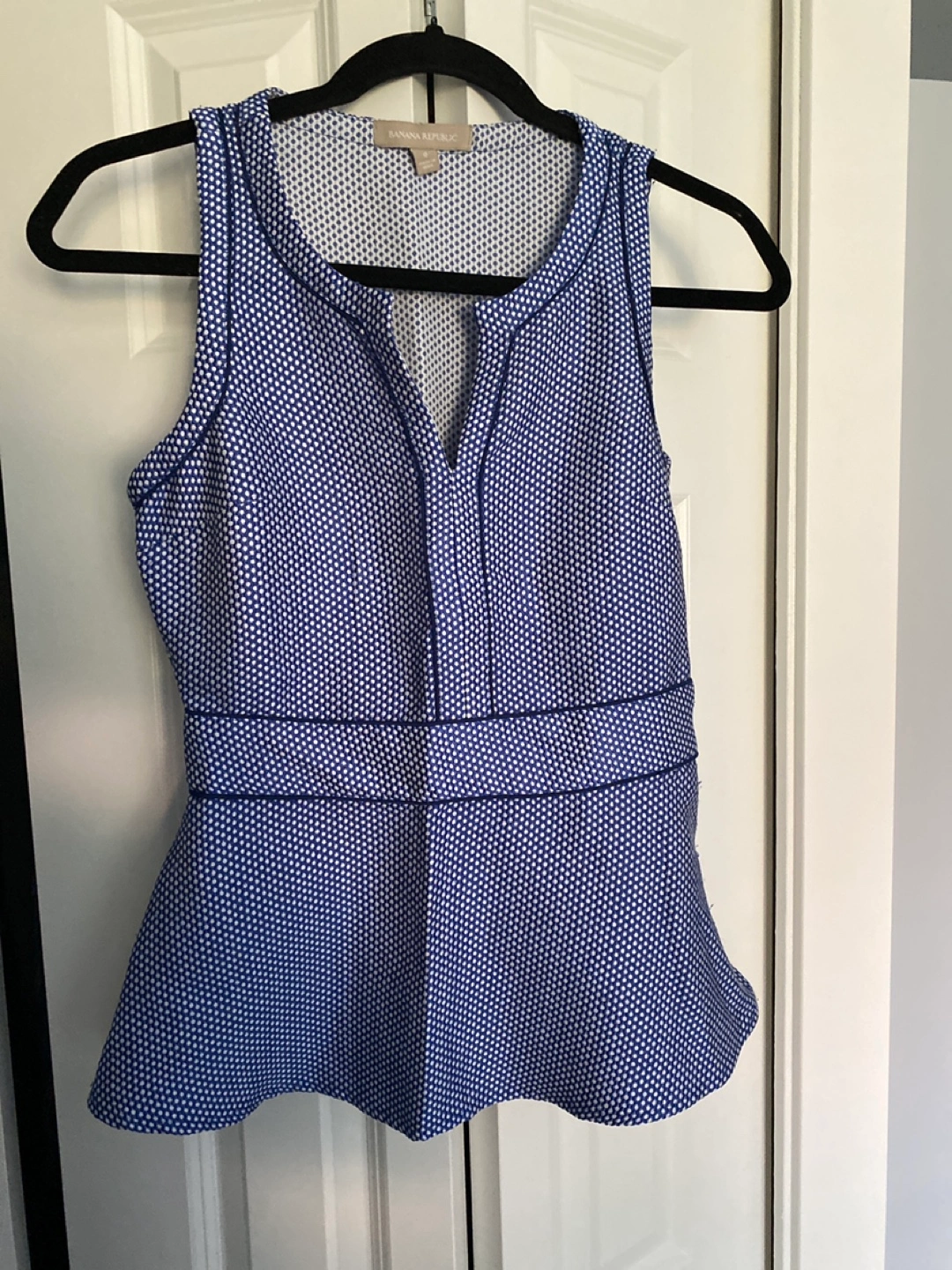 A cute Banana Republic sleeveless top in size 0. It's a stylish blue colour with a unique dotted pattern. Perfect for a casual day out or dressing up for an evening! As you can see in the last photo, it has some minor piling on the side, but otherwise in great condition.