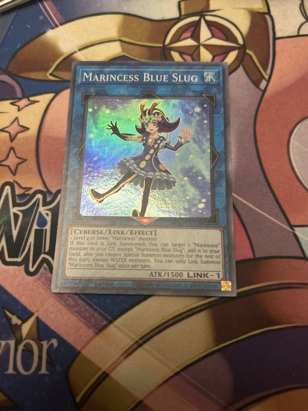 Selling a Marincess Blue Slug Yu-Gi-Oh! card. It's a Cyberse/Link/Effect monster with 1500 ATK and Link-1. If this card is Link Summoned, you can target 1 "Marincess" monster in your GY, except "Marincess Blue Slug", add it to your hand, also you cannot Special Summon monsters for the rest of this turn, except WATER monsters. You can only Link Summon "Marincess Blue Slug" once per turn