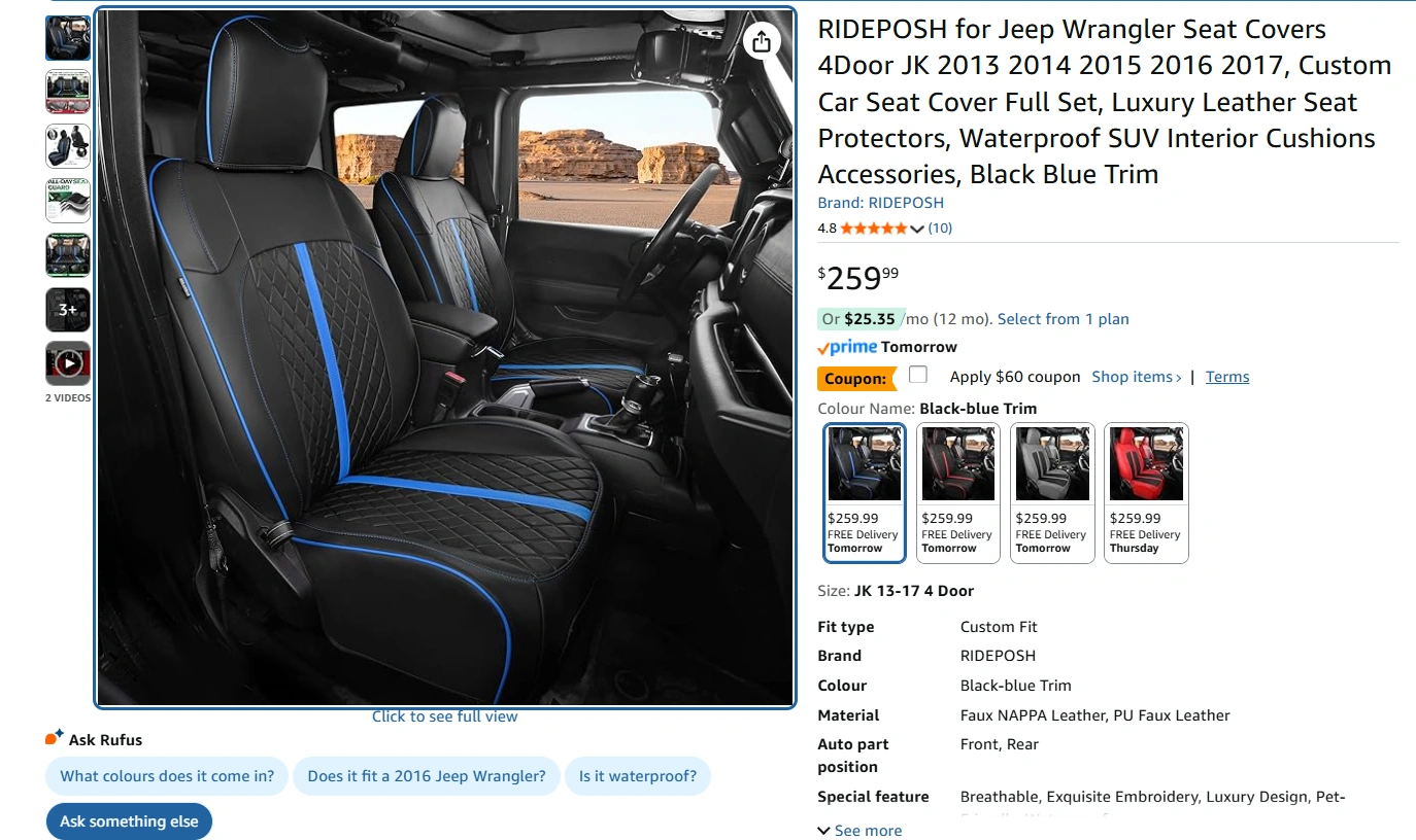 Jeep Wrangler Seat Covers 4Door JK 2013 2014 2015 2016 2017, Custom Car Seat Cover Full Set, Luxury Leather Seat Protectors, Waterproof SUV Interior Cushions Accessories, Black Blue Trim, Brand New in the Box/Sealed Sells for $200+tax on Amazon https://www.amazon.ca/dp/B0DRPFV51Z Features: 【Custom Car Seat Covers】: Precision cut and custom tailored to "2015 Wrangler Unlimited Sahara 4DR SUV" for a glove-like fit. Exclusively designed for Jeep Wrangler Seat Covers 4Door 2013 2014 2015 2016 2017, since they have the same or similar seat size. 【Luxury Leather Design】: RIDEPOSH luxury car seat covers maintain original interior style, featuring high-quality NAPPA Leather. Breathable, ultra-soft, skin-friendly leather car seat covers front seats to make your journey more comfortable. 【Superior Car Seat Protector】: These waterproof seat covers for Jeep Wrangler 4 Door JL adopts a four-layer structure, providing exceptional protection capabilities to safeguard your car seats from coffee spills and pet scratches. It is also easy to clean, simply wipe with damp cloths to make your waterproof car seat cover looks brand new for years. 【Maintain Existing Functionality】: Specifically tailored to fit snugly all details of car seat covers for Jeep Wrangler JL and ensure the full function, not affecting at all the use of airbag, armrests, safety belt, child safety Seats and seat adjustments. full wrap car seat covers front seats come with seat back organizer for improved user convenience. 【Easy to Install】: RIDEPOSH for Jeep Wrangler SUV seat covers, comes with installation accessories set. Follow installation video and manual guide, RIDEPOSH car seat protectors are easy installed within 40mins. (Patience is required to achieve a snug fit)