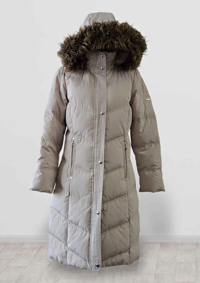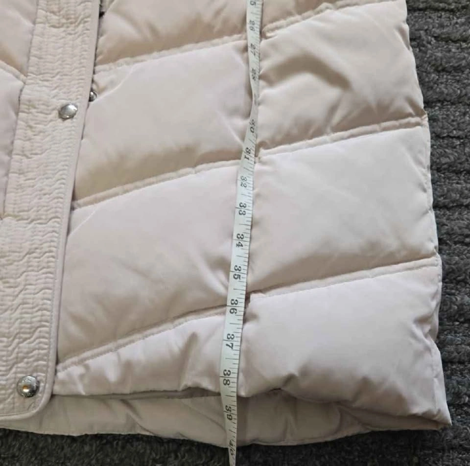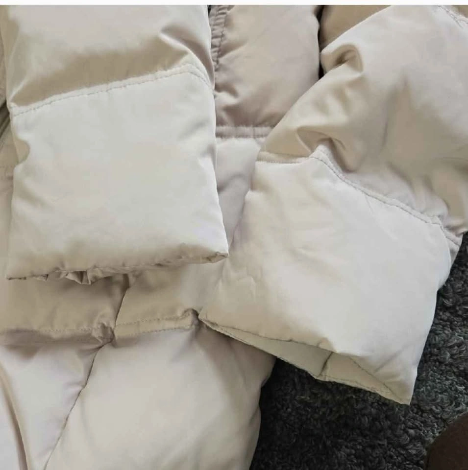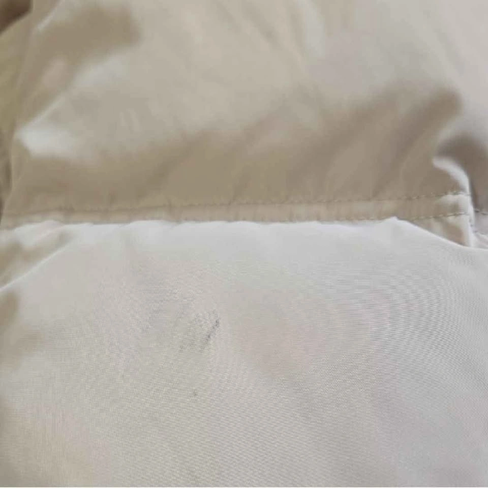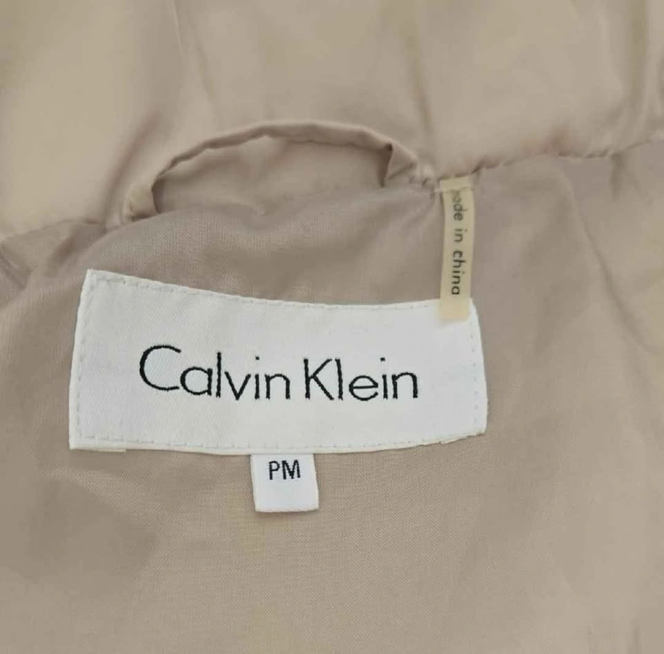 Calvin Klein beige long puffer coat with removable hood. Except for the minor stain as shown in the photo (looks like it can be removed by washing), the coat is in excellent condition.