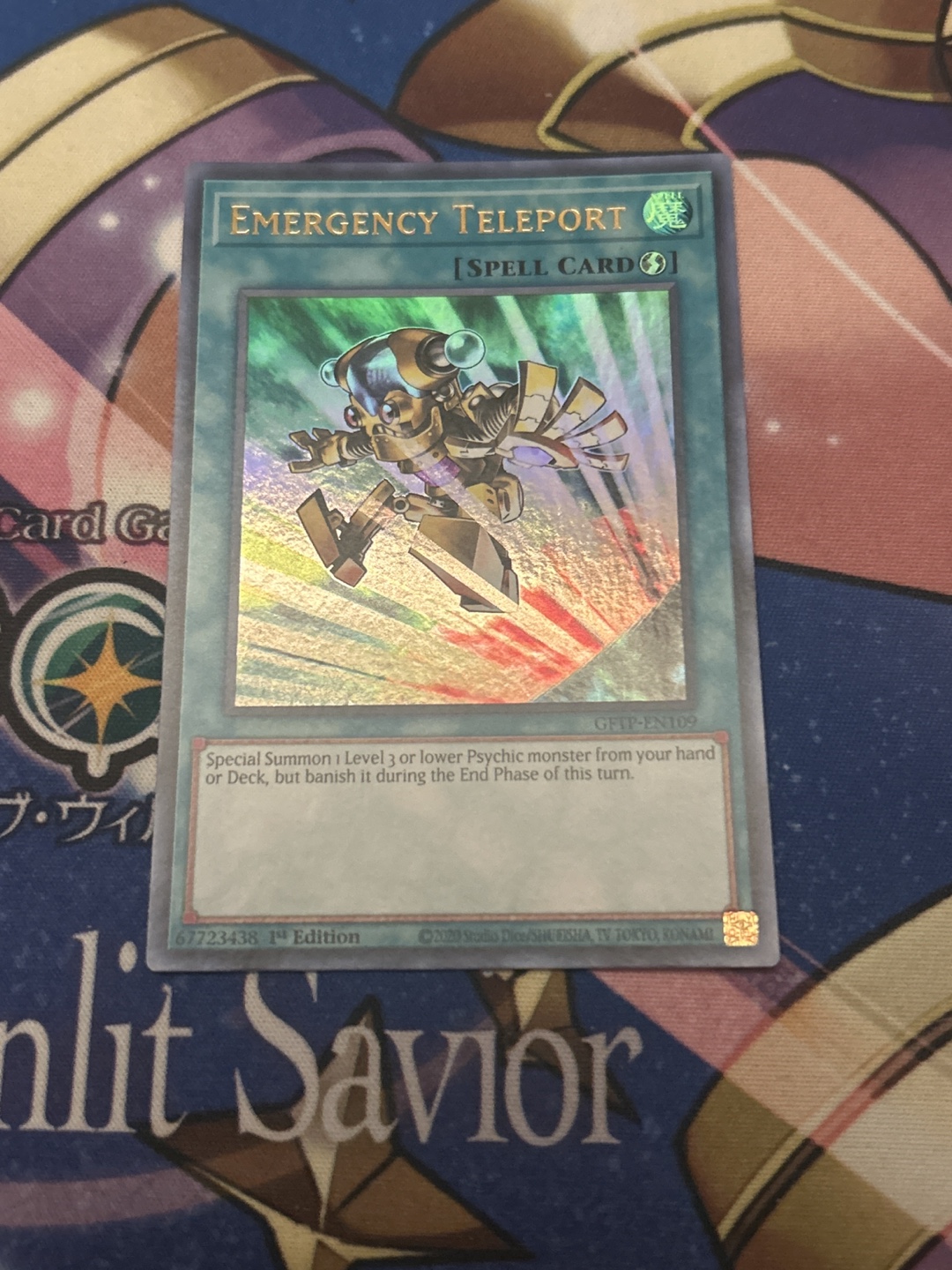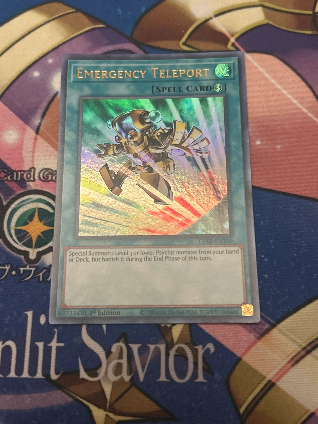 Selling a Yu-Gi-Oh! card: Emergency Teleport [SPELL CARD]. It's a 1st Edition card with the ID 67723438. Special Summon 1 Level 3 or lower Psychic monster from your hand or Deck, but banish it during the End Phase of this turn
