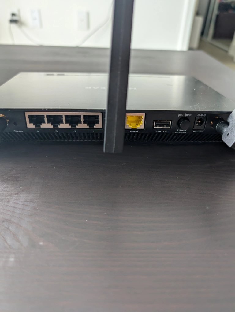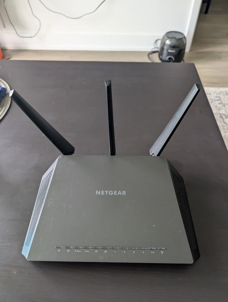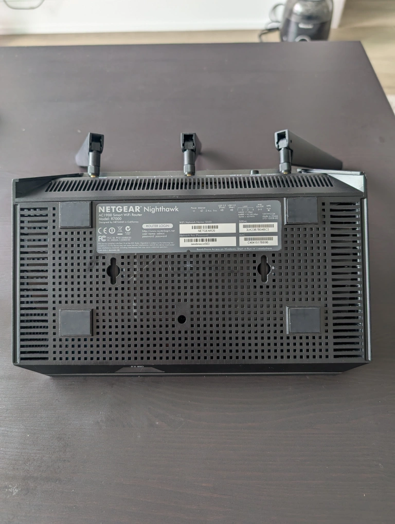 No adaptor available. But works 100%. Selling a Netgear Nighthawk AC2300 Smart WiFi Router. It's a reliable router that's perfect for home use. It has three antennas for a strong and stable connection.