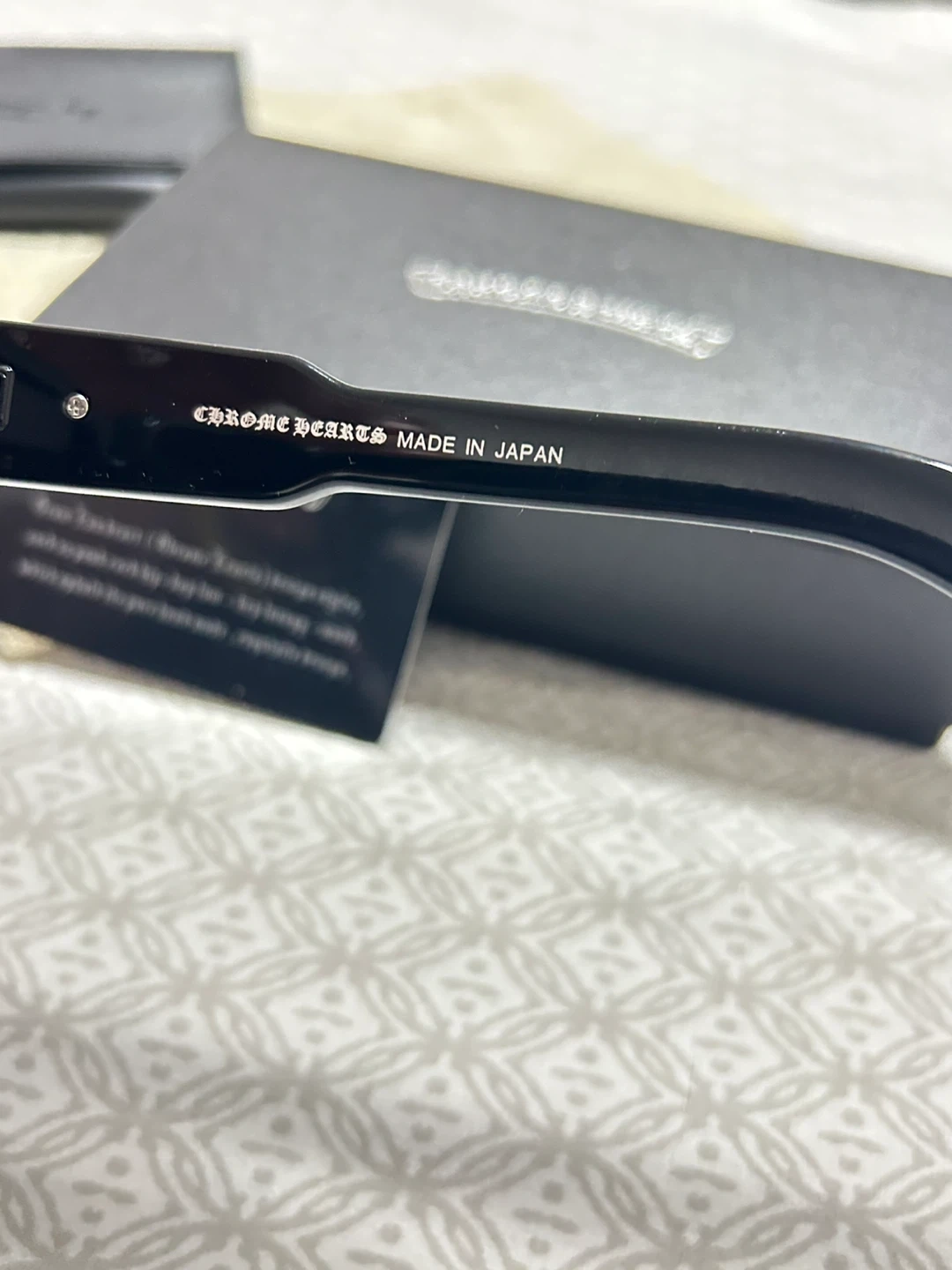 65Selling a pair of Chrome Hearts sunglasses. They are black and say 'Made in Japan' on the side. The box is included!