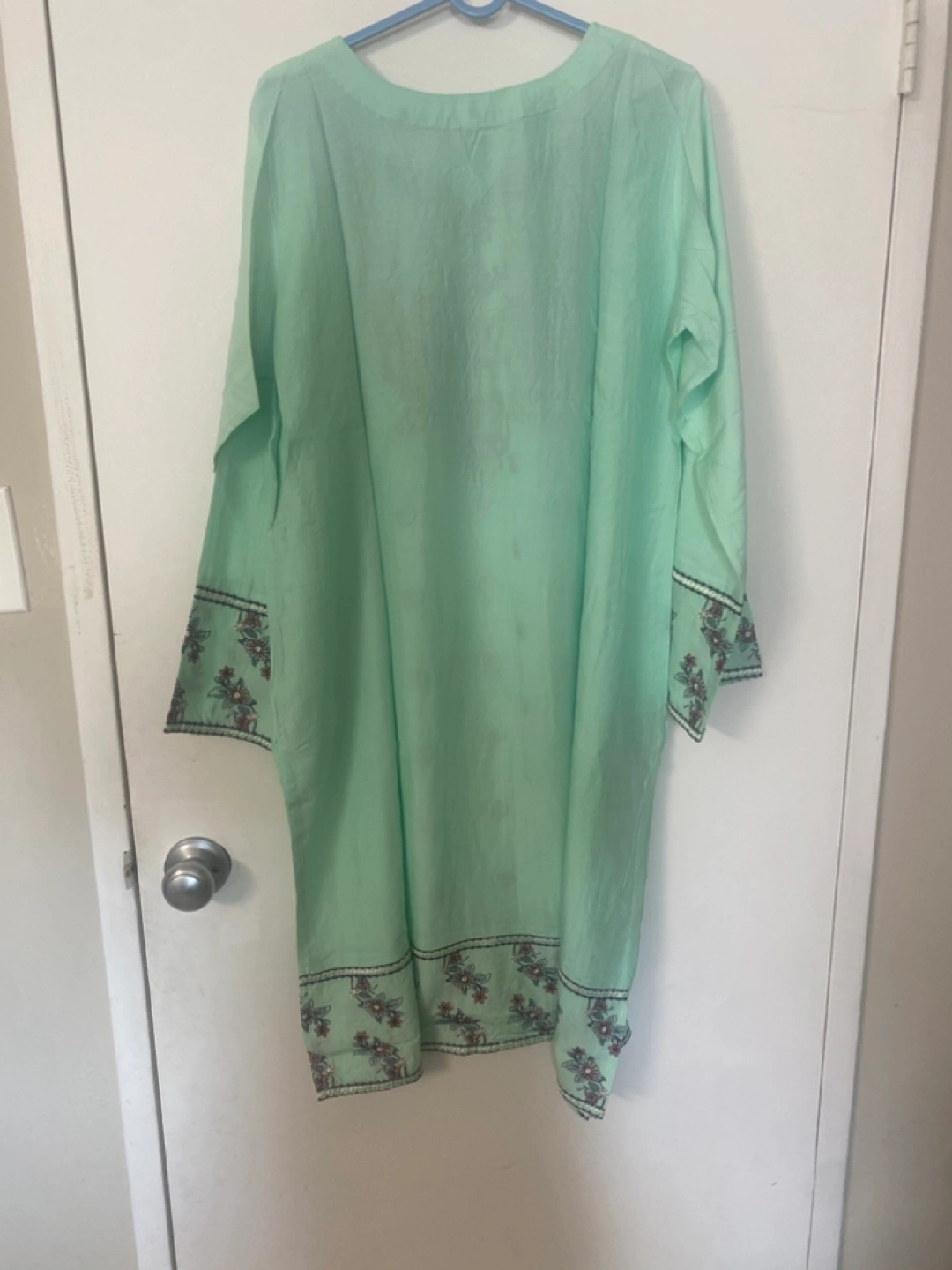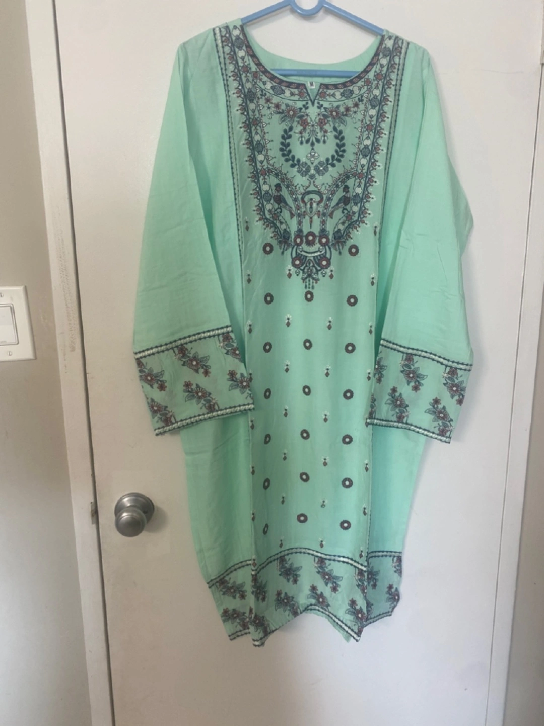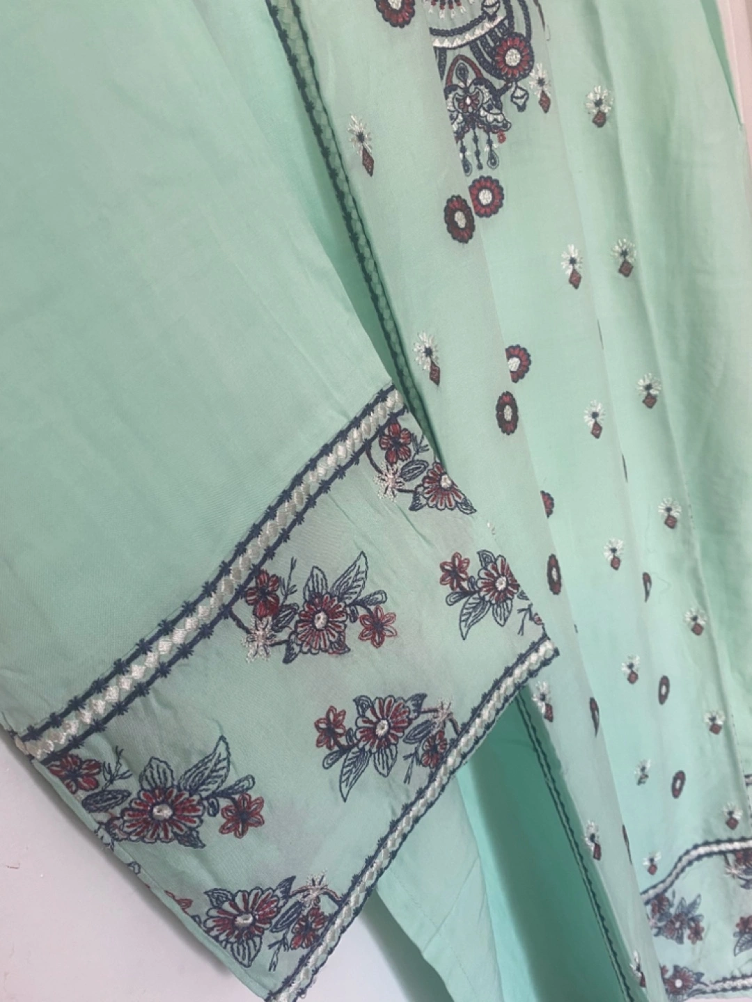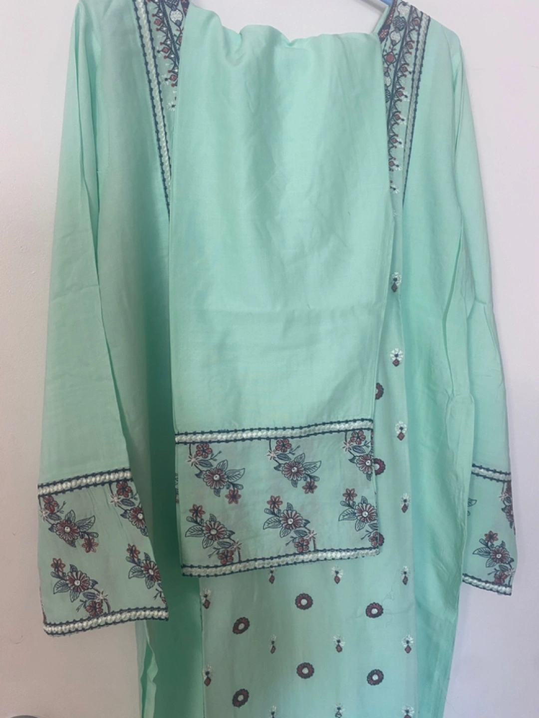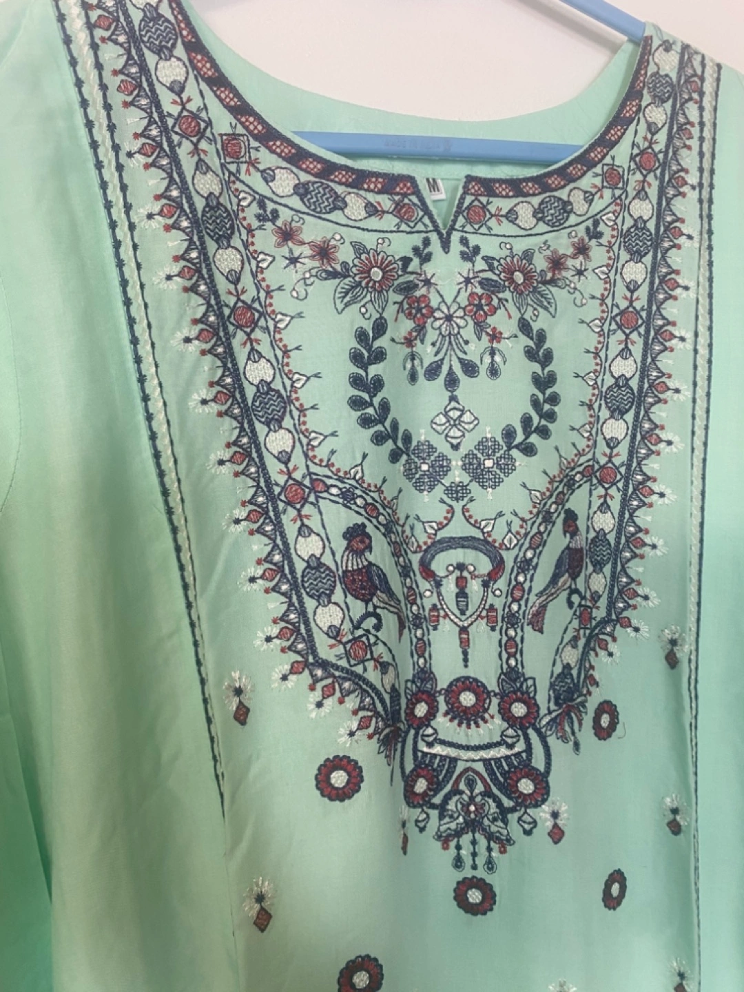 This is a beautiful mint green kurta and pant set with intricate embroidery. It's a stylish and comfortable outfit perfect for various occasions. The fabric feels nice and light, making it great.