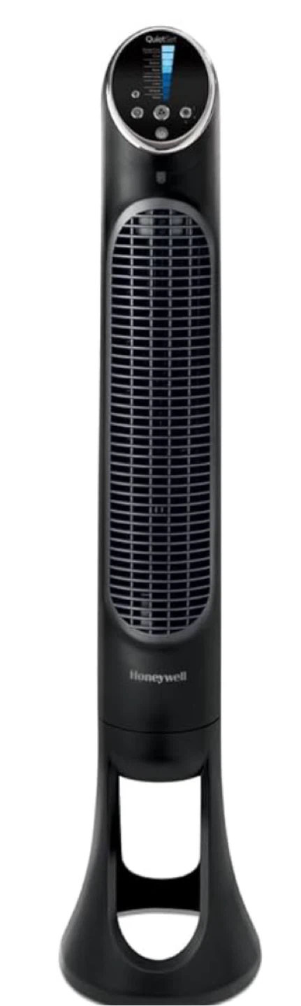 Keep cool in hot weather with the Honeywell 40-inch Tower Fan in Black. The Honeywell 40-inch Tower Fan offers quiet cooling with eight fan speeds and one-touch oscillation. Featuring a remote control and an auto-off timer function, this powerful fan is an excellent choice to keep the temperature down in any room and quiet enough not to interrupt your sleep. The moulded carrying handle ensures effortless transport, while the sturdy base keeps this fan in place.