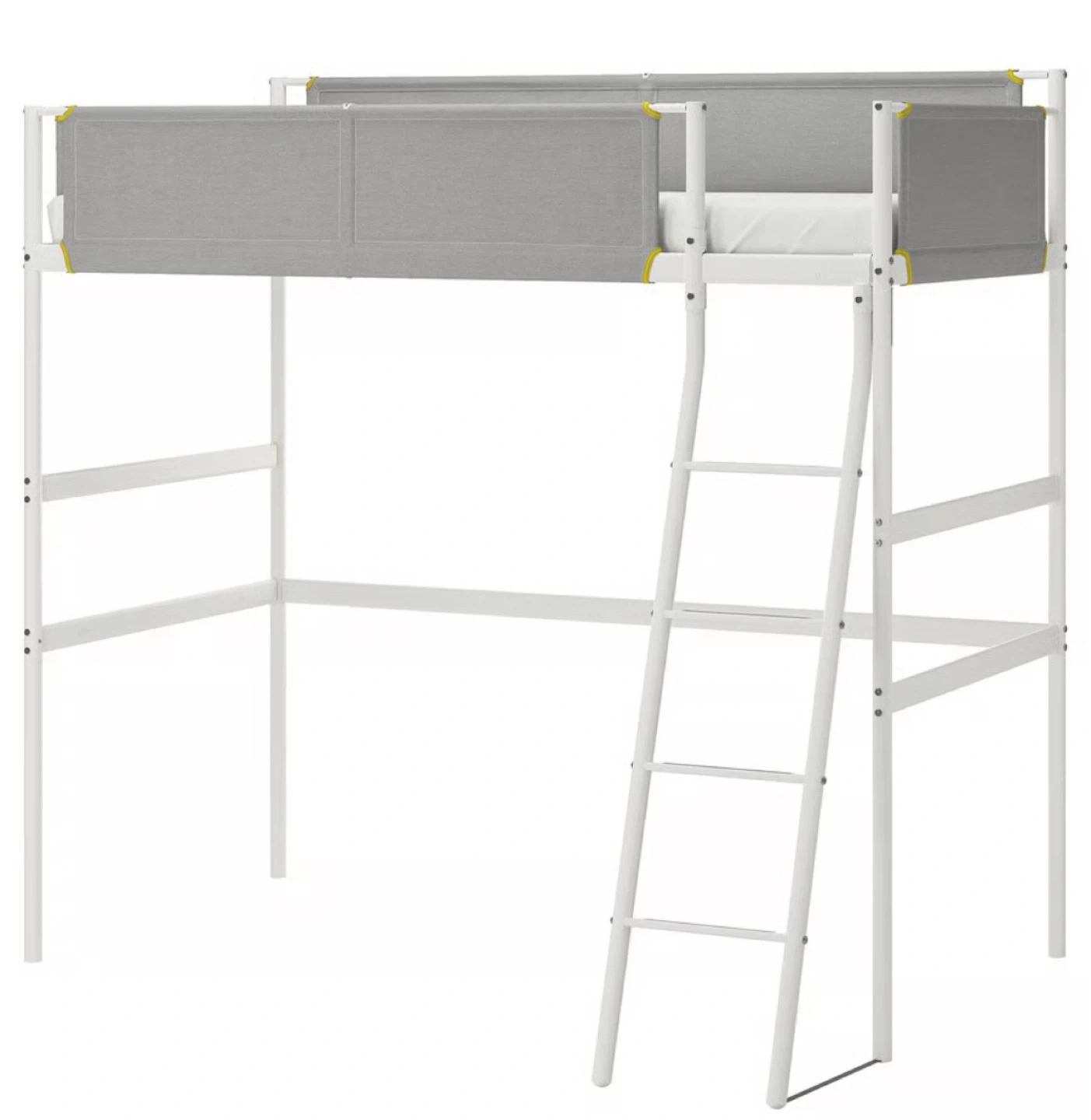 Selling an IKEA loft bed frame in white! Included Bed foam, table and swivel chair) It's in great condition and a perfect space-saver for smaller rooms.