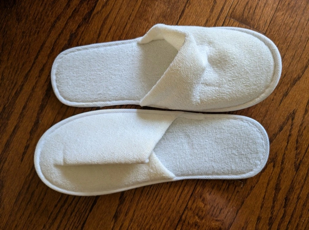 A pair of white terry cloth slippers. They are comfy and ready for a relaxing day at home! For Men or Women