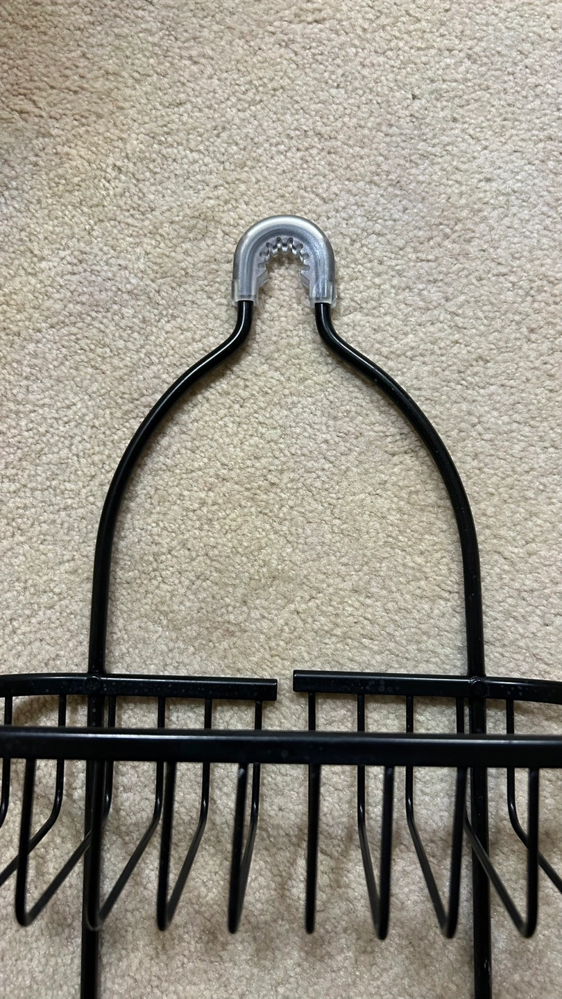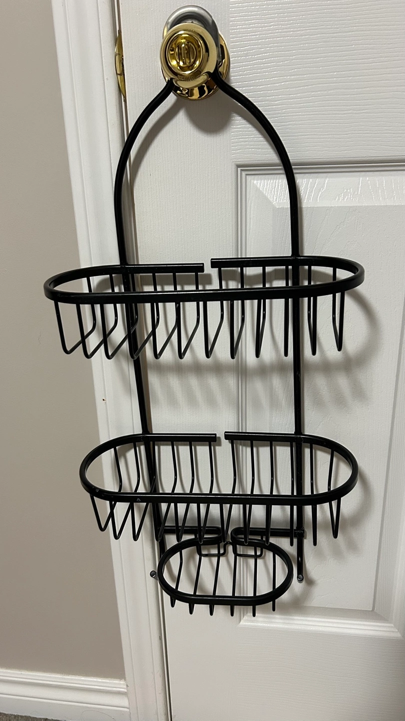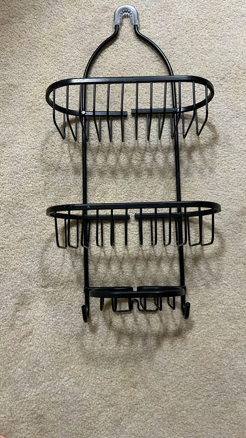 This is a black over-the-shower caddy. It has two shelves and a smaller rack at the bottom. It's in great condition and ready to help organize your shower!