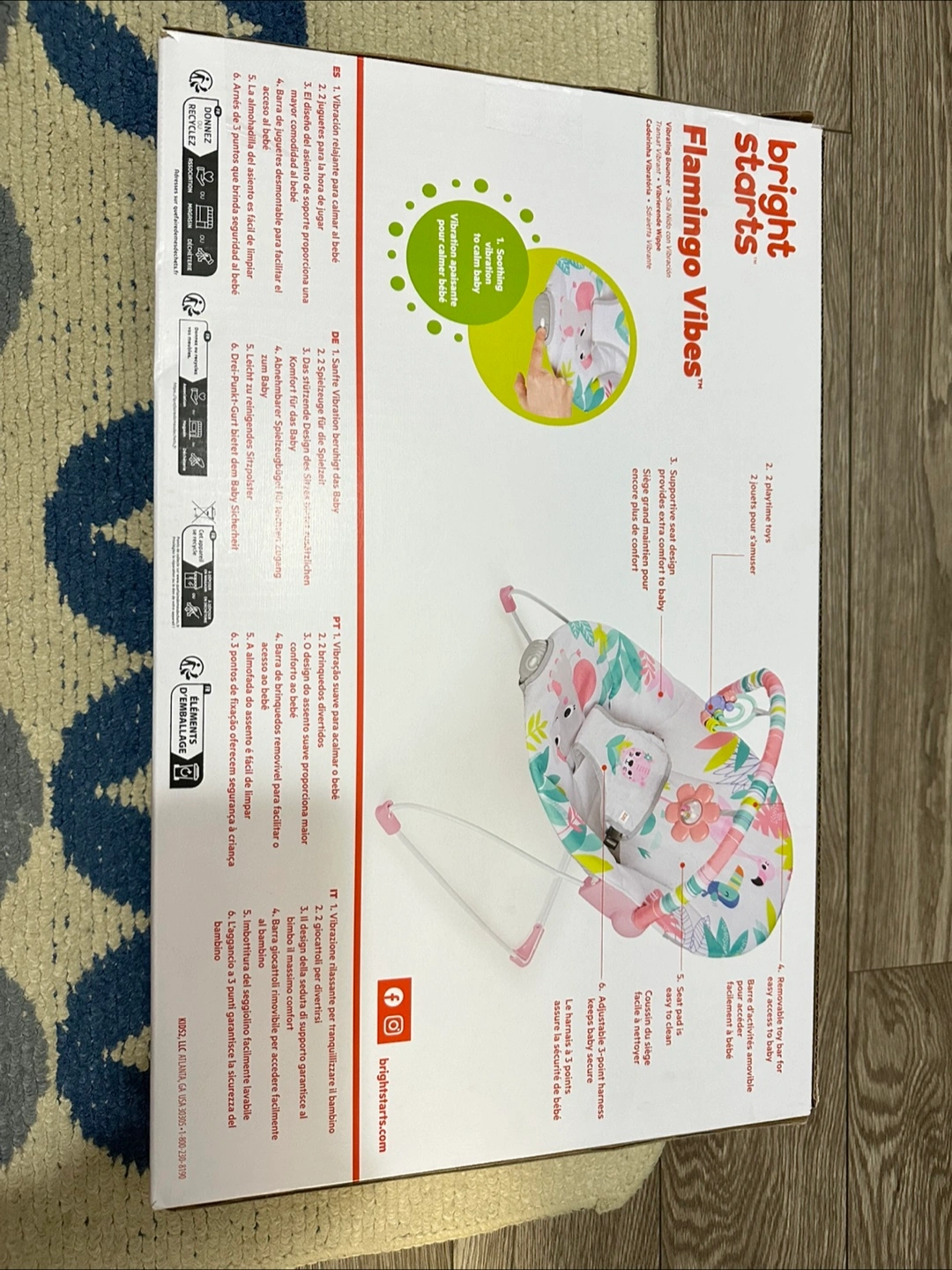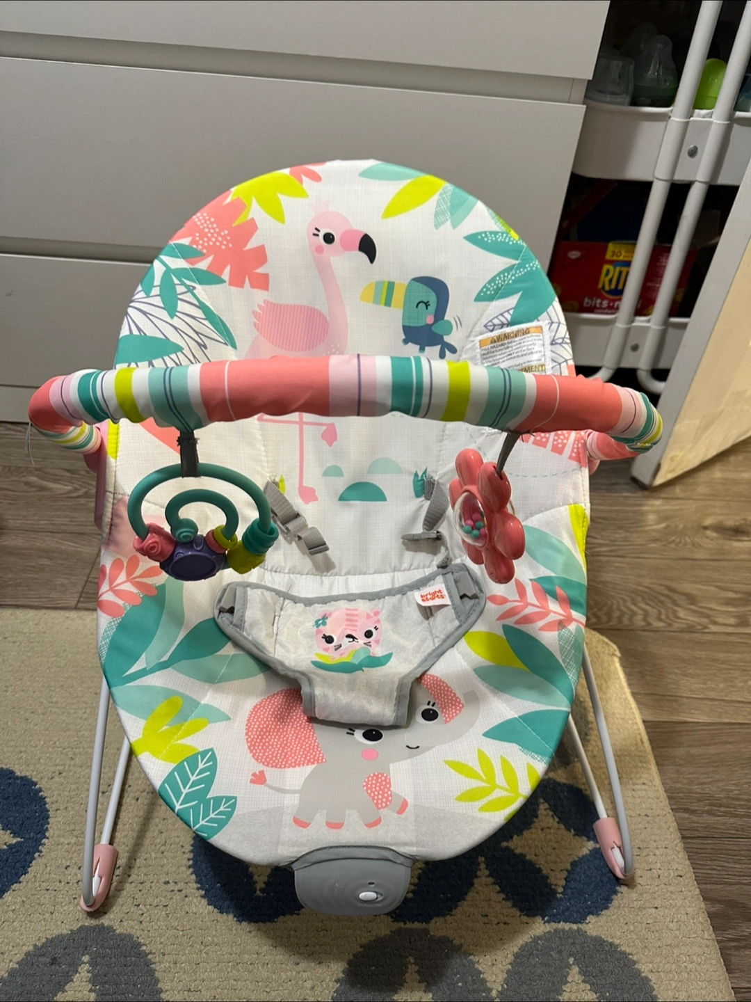 - This specific bouncer I’m selling includes a battery-operated vibrator, a removable bar with two toys your baby can play with and has a 3-point harness for safety