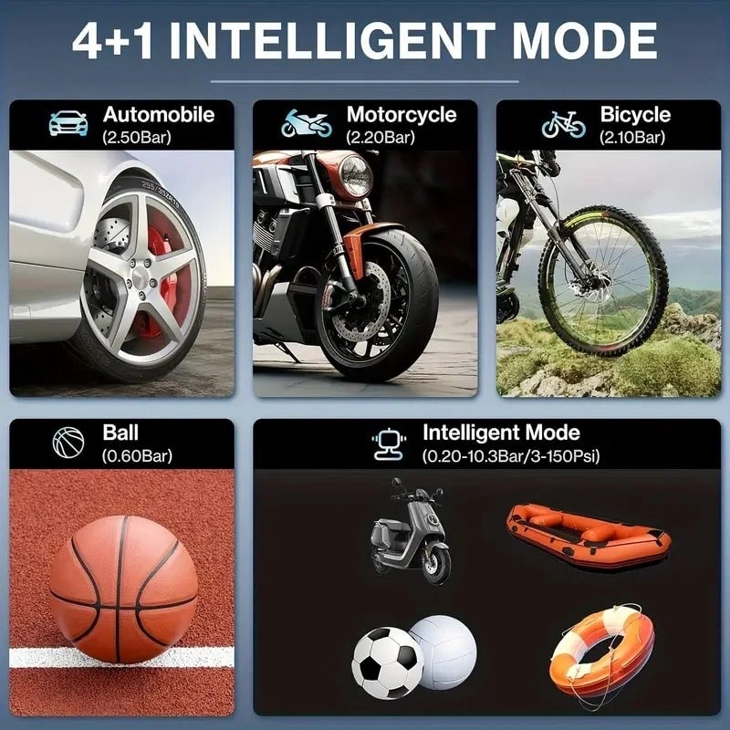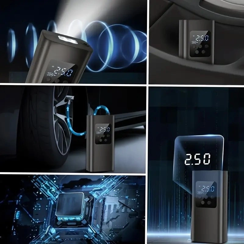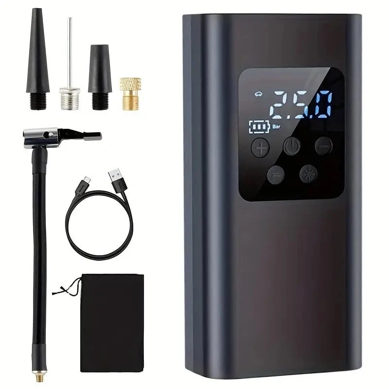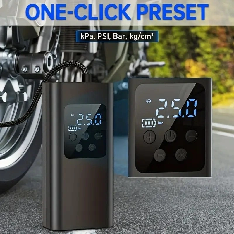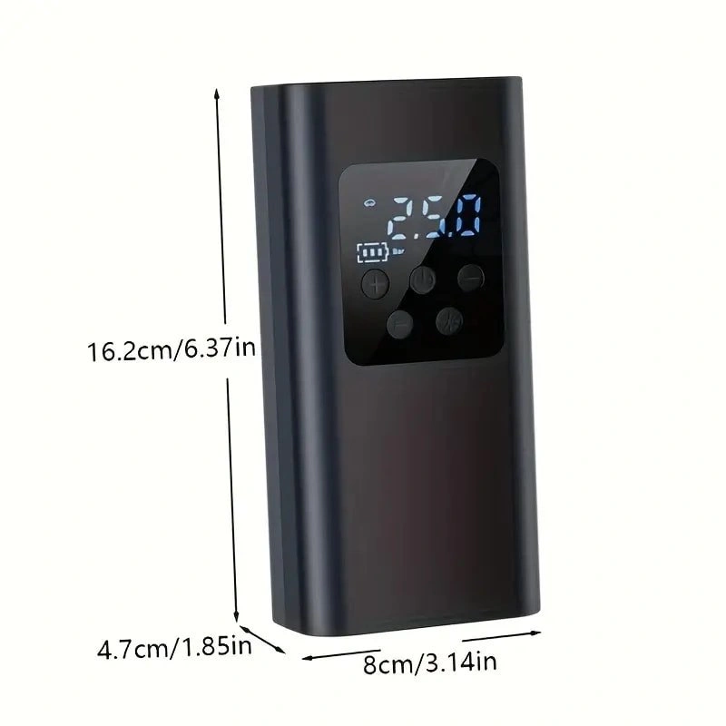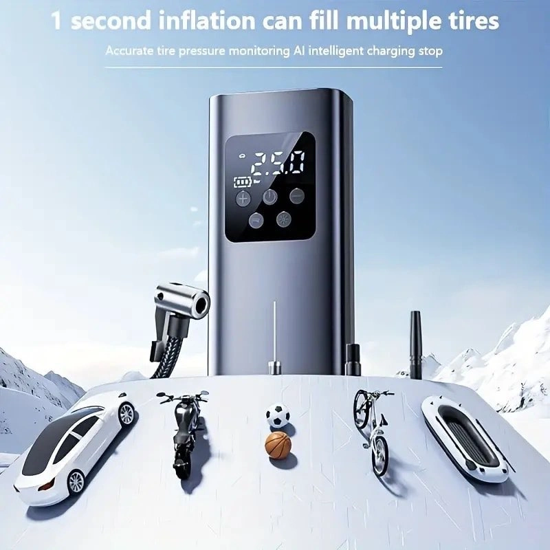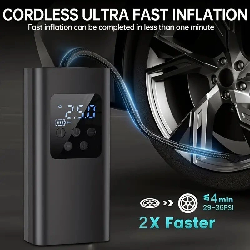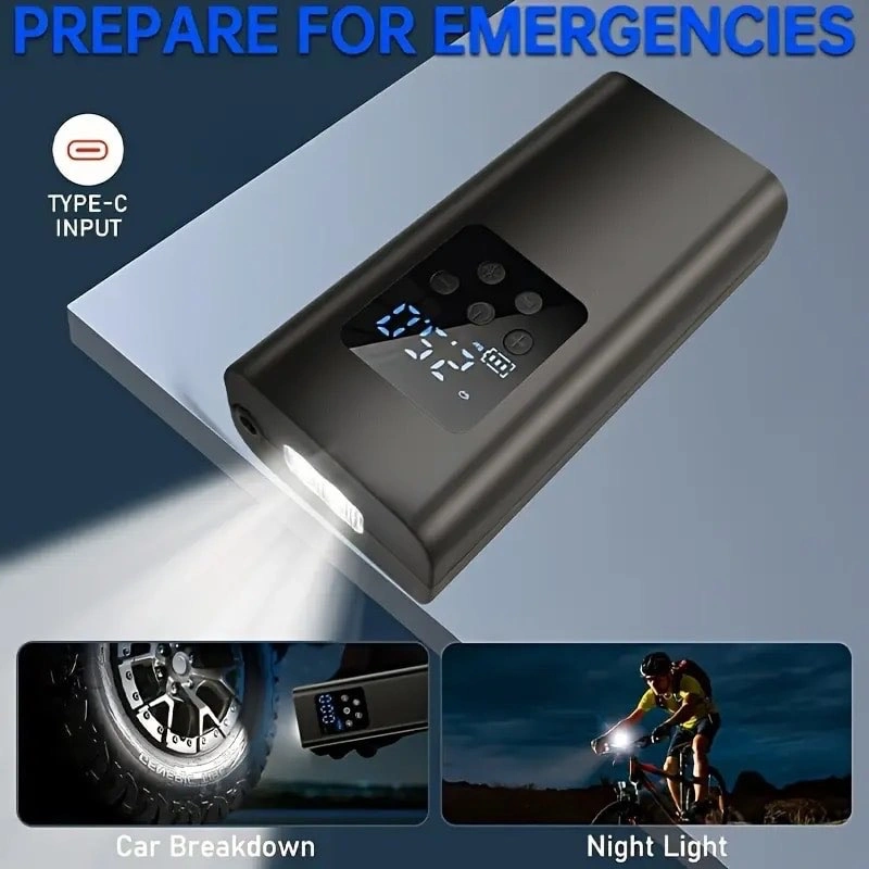 Powerful, Portable, and Fast – Your All-in-One Air Compressor Say goodbye to slow, bulky inflators! This high-performance air compressor comes with a built-in 25,000mAh battery, so there’s no need for an external power source. It’s up to 3x faster than standard cordless inflators thanks to a 35% power boost—inflating tires in under a minute. And if the battery runs low, simply plug it into your car’s cigarette lighter to keep going. Smart & Easy Inflation with Display The dual LCD screen shows both the current and target pressure, making it easy to monitor as you go. The advanced chip delivers up to 180 PSI with a powerful airflow of 30 L/min, and it automatically shuts off when your preset pressure is reached—so you can inflate with confidence, every time. Versatile Modes for All Your Needs Choose from 4 preset modes for cars, bikes, motorcycles, and balls, or use the custom mode to set your own pressure between 3–150 PSI (0.20–10.3Bar). Select from four pressure units: PSI, KPA, BAR, and KG/CM²—whatever suits your preference. More Than Just a Tire Pump Perfect for home, travel, and emergencies, this compact inflator also features a USB port (5V/2A) to charge your phone or other devices on the go. The built-in LED emergency light helps when inflating or changing a tire at night or signaling for help. Everything You Need in One Box The kit includes: * Cordless air pump * Air hose * Nozzle & adapters (ball needle, French adapter, stingy mouthpiece) * Fuse wire * DC power cord * USB charging cable * User manual * Handy storage bag Compact enough to keep in your car, bike rack, or backpack, this air compressor is your reliable companion for every road trip, ride, or emergency. Price is fixed. Local pickup in Richmond Hill
