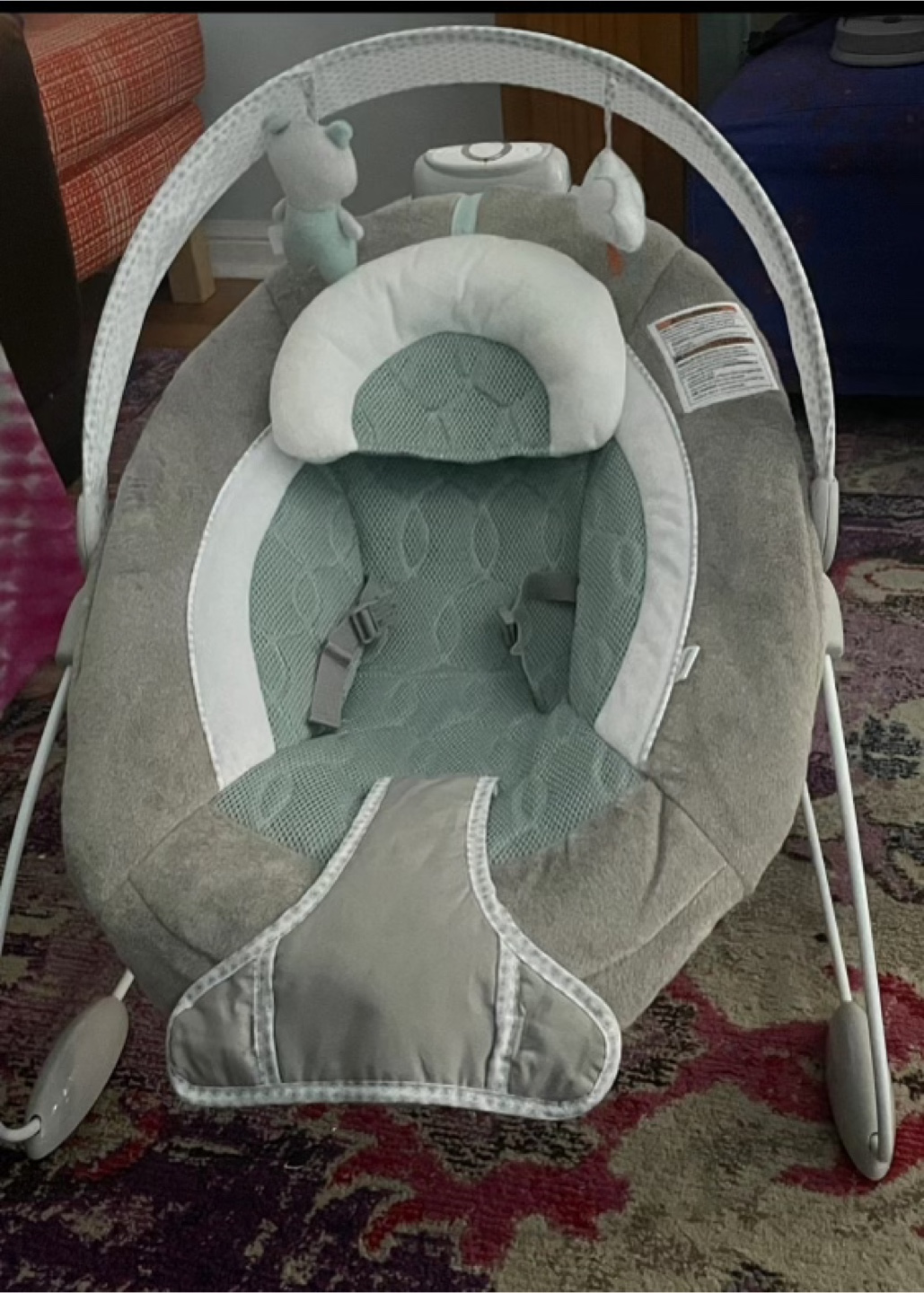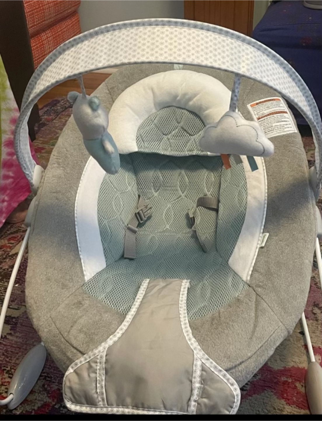 Selling an Ingenuity baby bouncer in excellent condition! It features a soft, comfortable seat with a supportive headrest. The overhead mobile has cute toys to keep your little one entertained. It's perfect for soothing and relaxing your baby.