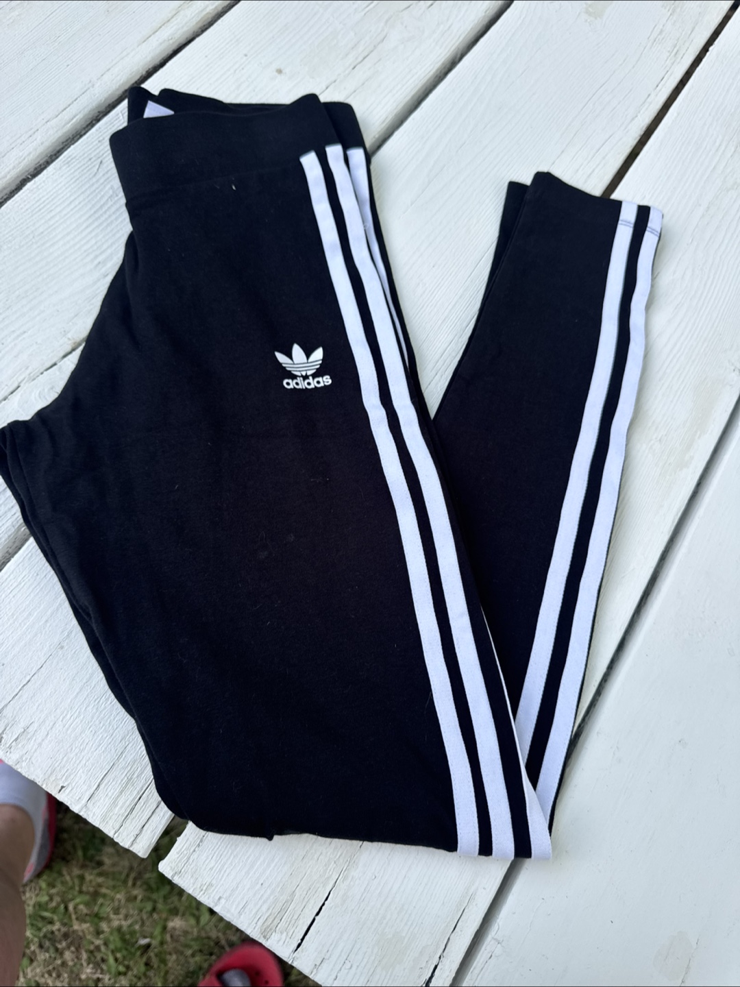 Selling a pair of Adidas leggings in black with the classic white stripes down the sides! They're in great shape and ready for a new home. Perfect for workouts or just lounging around. Adidas is a great brand for quality activewear!