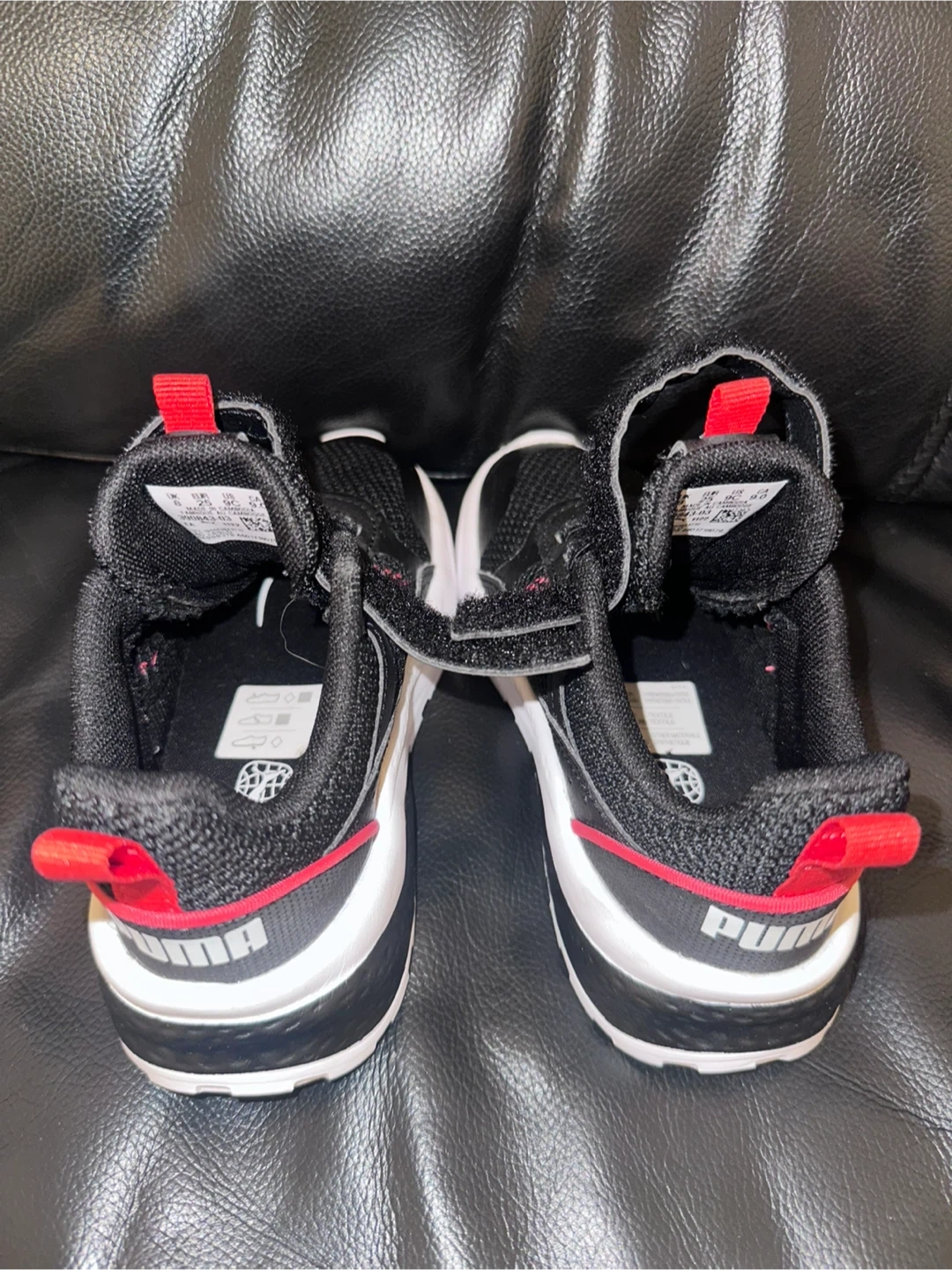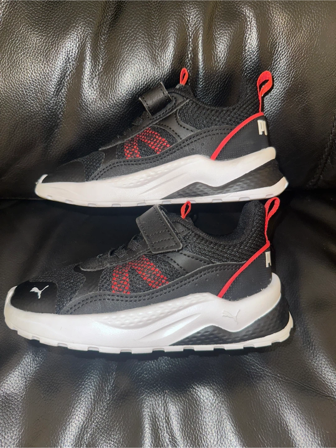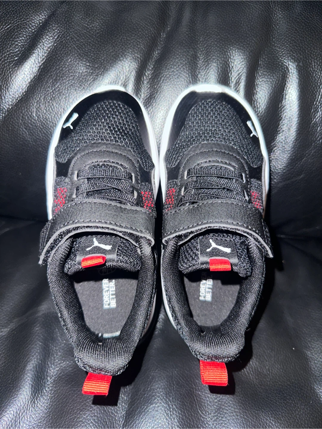 Selling a pair of Puma Anzarun 2.0 sneakers for kids. They feature a stylish black and red design. Perfect for active kids!