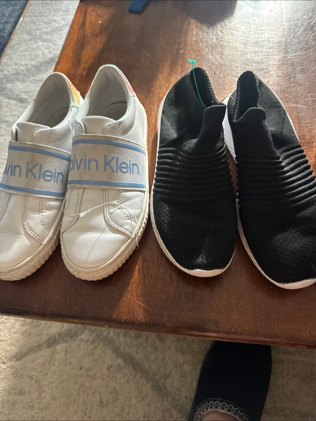 Selling a pair of Calvin Klein white sneakers, along with a pair of black slip-on shoes. Both are in good condition!