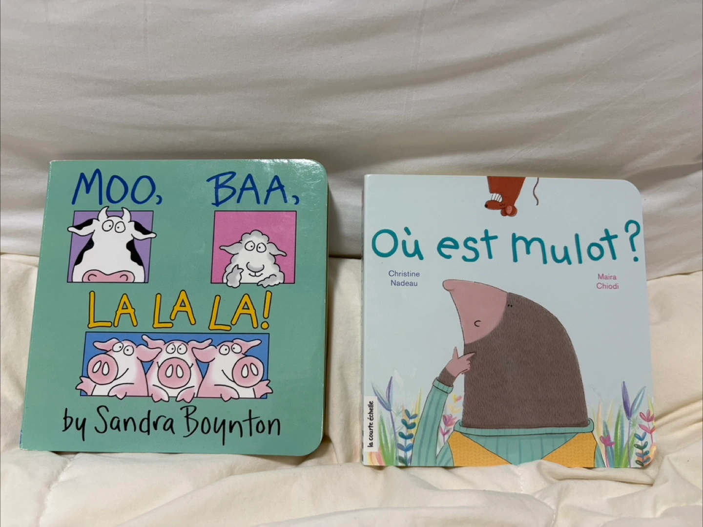 Two adorable board books for little ones! One is 'Moo, Baa, La La La!' by Sandra Boynton, a classic for introducing animal sounds. The other is 'Où est mulot?' by Christine Nadeau and Maira Chiodi, a cute story in French.