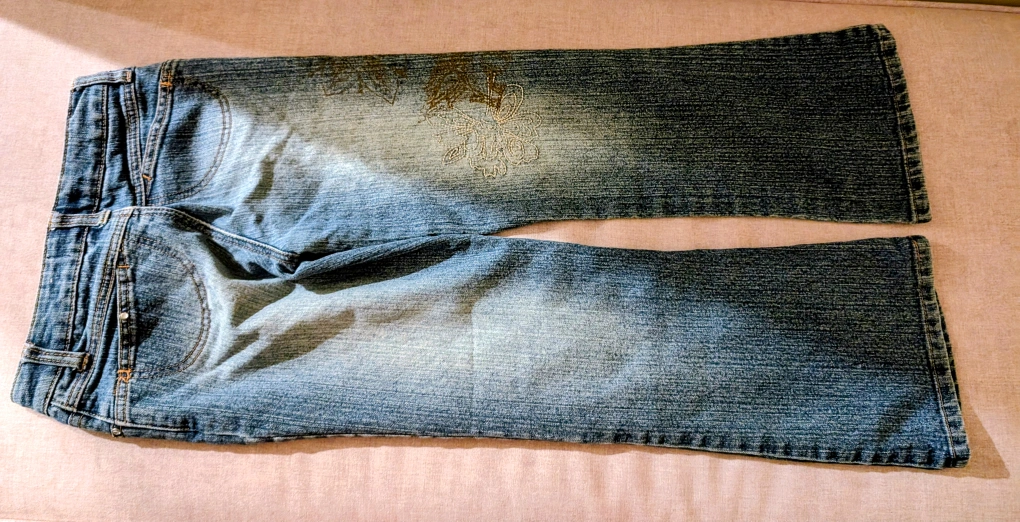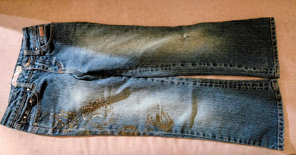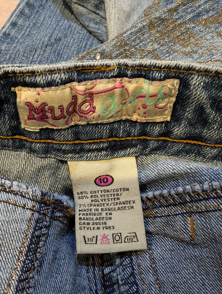 A pair of Mudd Girl jeans in size 10. Very stylish design of bleach wash denim with a combination of embroidery, a tear, screen printing and rhinestones